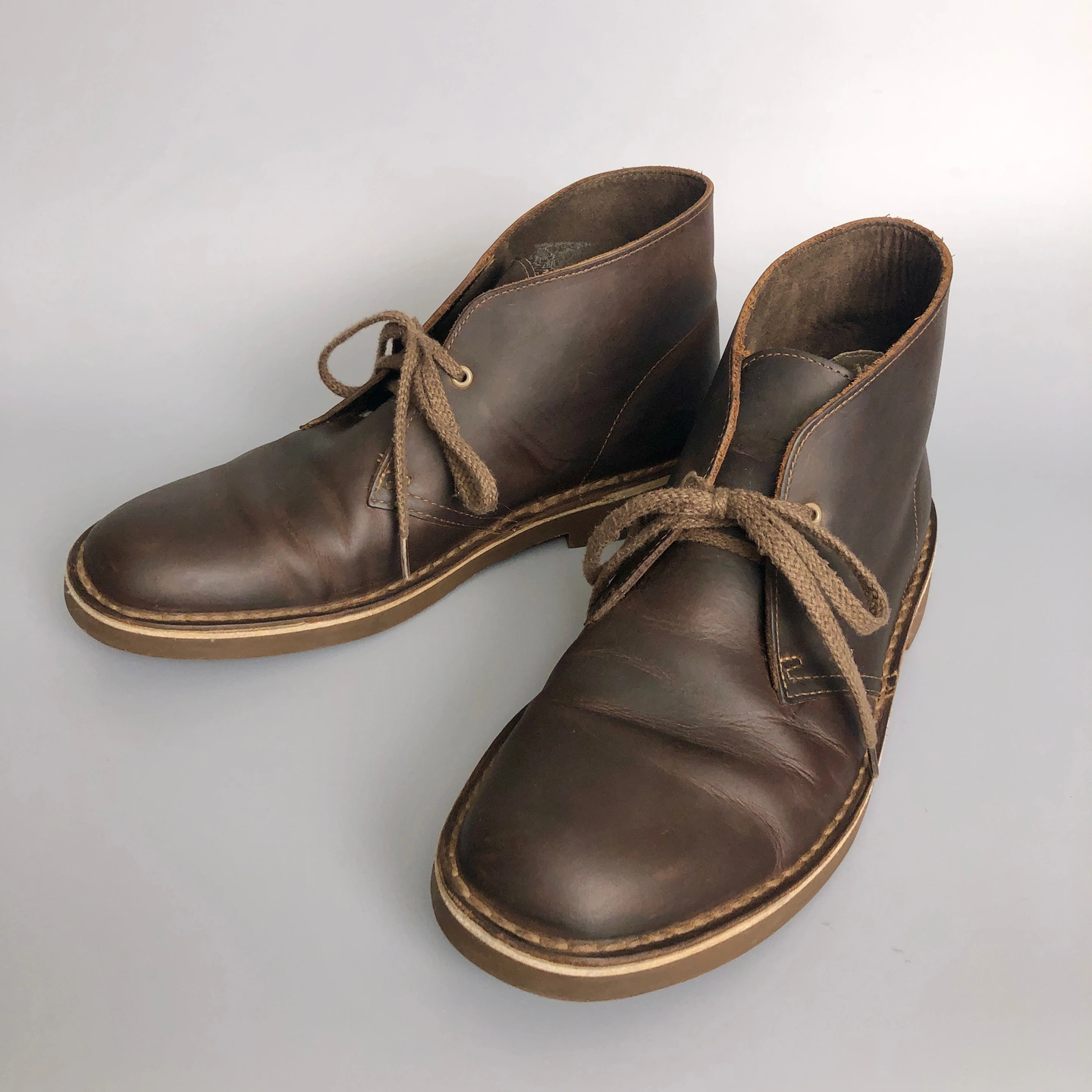 Gently used Clarks leather shoes. Appears to be have worn less than 10 times. Loads of life left on them still. Very nice looking leather! A few light scratches. US 8M EU 41 MSRP $170 Our icon, re-engineered for modern life: introducing the Clarks Desert Boot Evo. With a signature aesthetic updated with 21st-century comfort features, the original last has advanced in shape to provide an optimum fit, and layers of breathable comfort combine with a durable, crepe-effect rubber sole for lightweight movement. The ultimate balance of heritage style with technical evolution. + Responsibly sourced beeswax leather upper. + Heritage Clarks flexible stitch-down construction. + Durable, recycled-content rubber sole delivers excellent traction. + Additional recycled material in laces minimises environmental footprint. Tags: shoes, boots, leather, brown, classic, classy, Clarks, dress, dress shoes, premium, men, men's, 8,