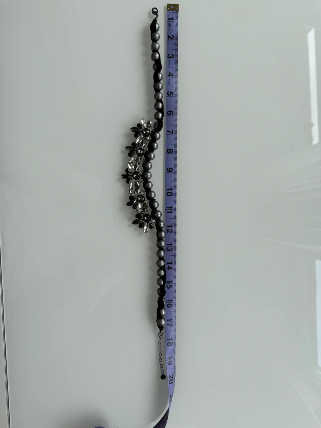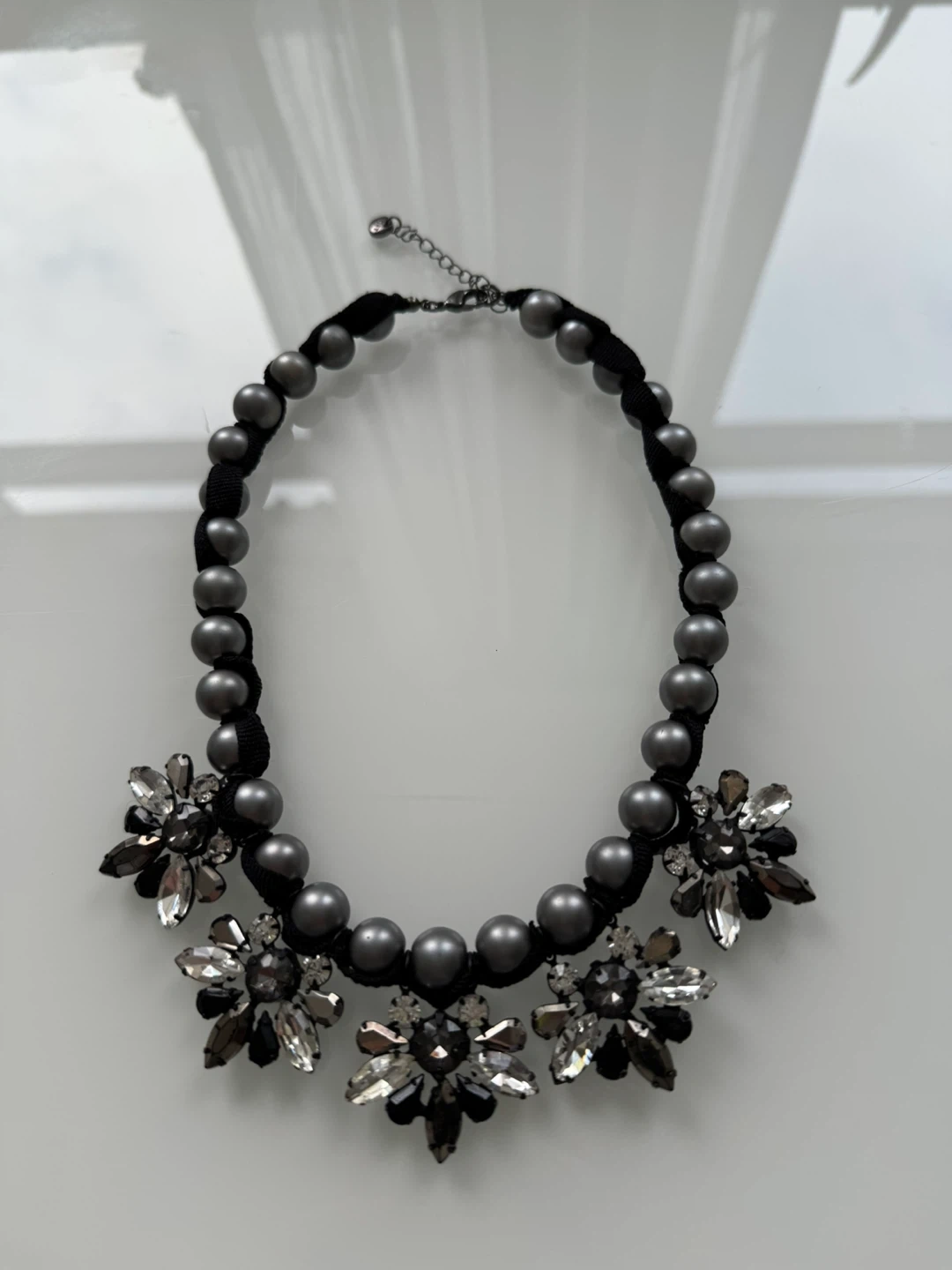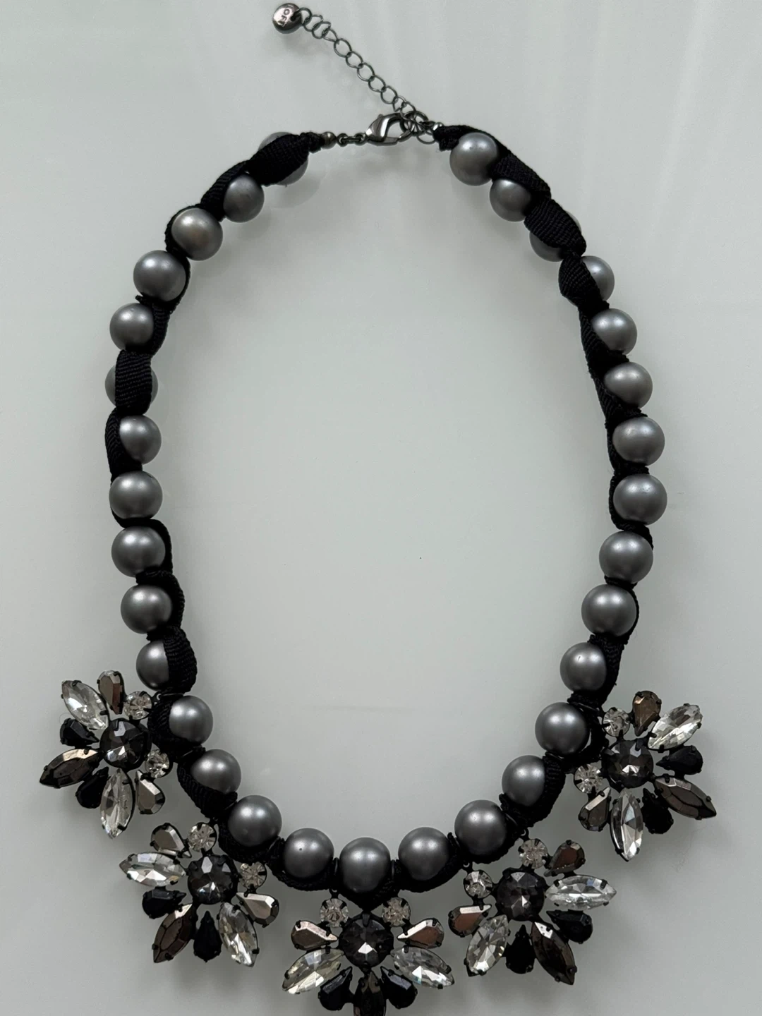 This is a beautiful statement necklace! It features grey beads and black floral accents with clear crystals. It's in great condition and would be a perfect addition to any outfit