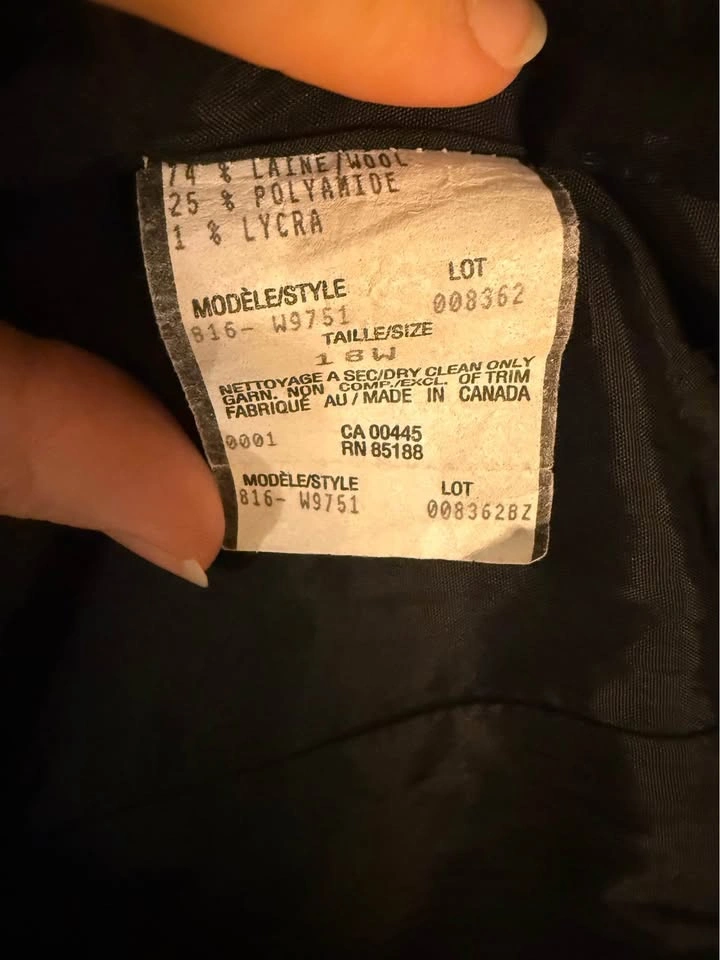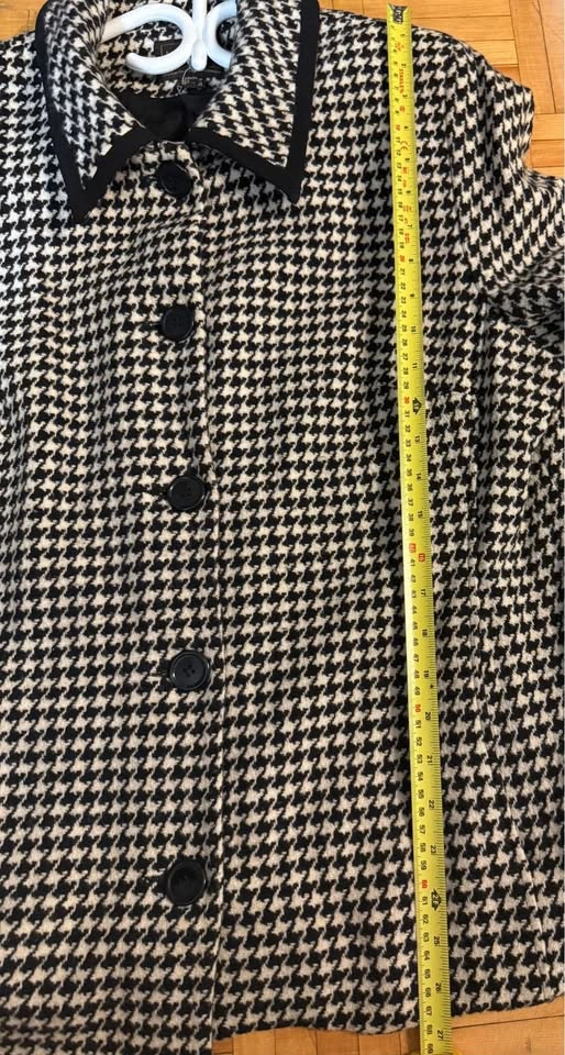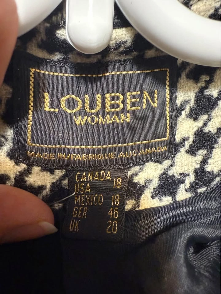 Louben woman, made in Canada, cream & black houndstooth jacket/blazer. 5 buttons. Functional pockets in front. Lined. Light padding in shoulders. More of a boxy fit. Great, classic piece for fall & winter. Wool blend See pictures for measurements for sizing; tagged as size 18 Pick up near Queen St W & John St.