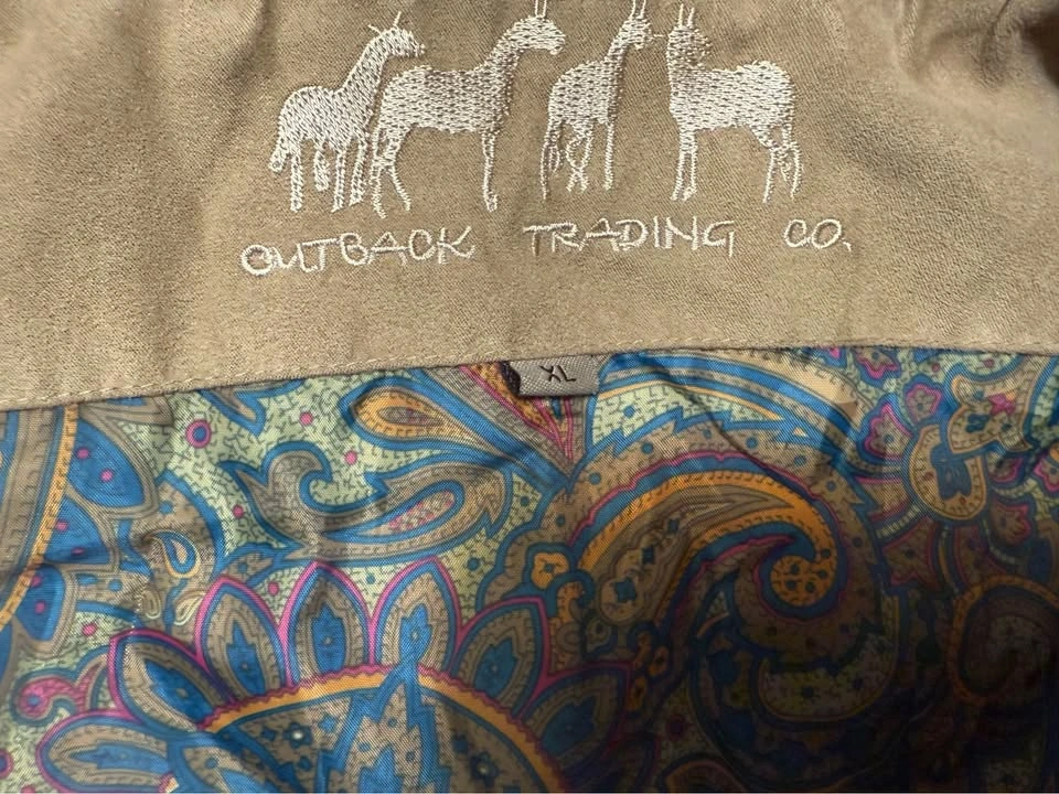 Outback Trading Co. Ladies microsuede grand prix vest. Quilted. Virtually brand new and in excellent condition. 4 pockets - 2 external, 2 internal. Adjustable at the side/back to cinch waist. Slightly longer in the back for a flattering fit. Sturdy zipper closure. Beautifully made with a stunning paisley print lining! Taupe colour - pictures where it is hanging up read much warmer than the colour truly is, please refer to other photos where it looks like a cooler taupe as that is the true colour See pictures for composition and measurements; tagged as XL Pick up near Queen St W & John St.