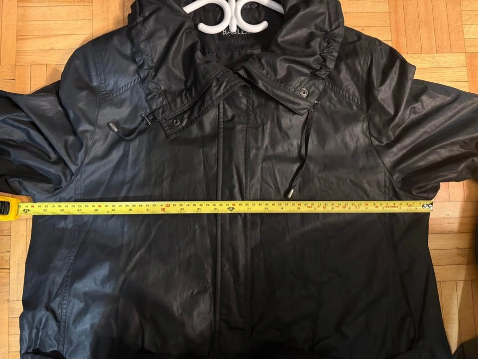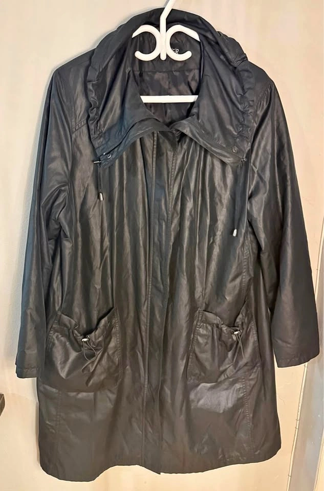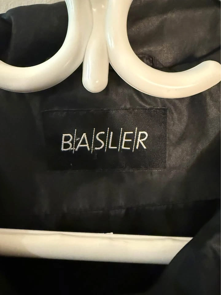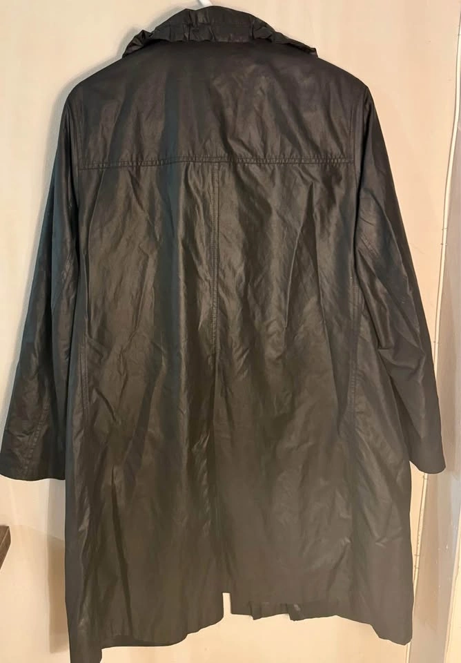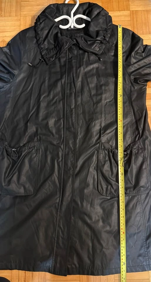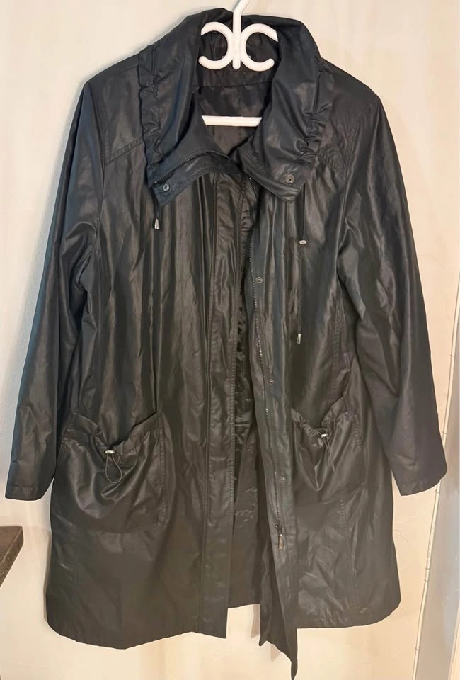 Basler long black rain jacket/coat, vintage. German brand and typically made in Germany. Cinchable collar and pockets. Collar can be scuba style. Straight fit. Light weight. Lined. Slit at the back. Great piece for fall & spring! See pictures for measurements & composition. Pick up near Queen St W & John St.