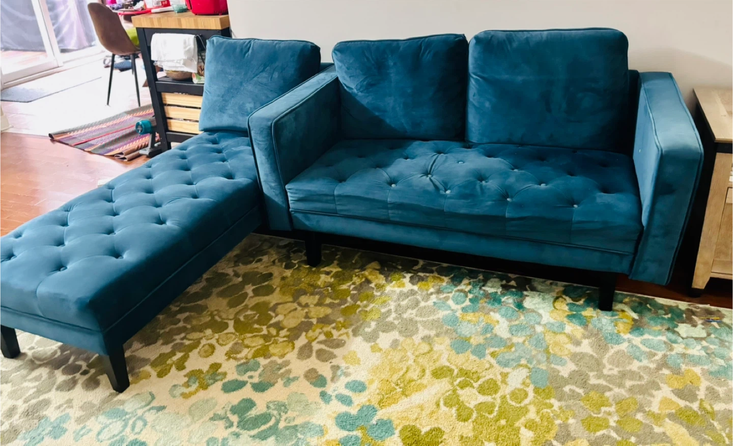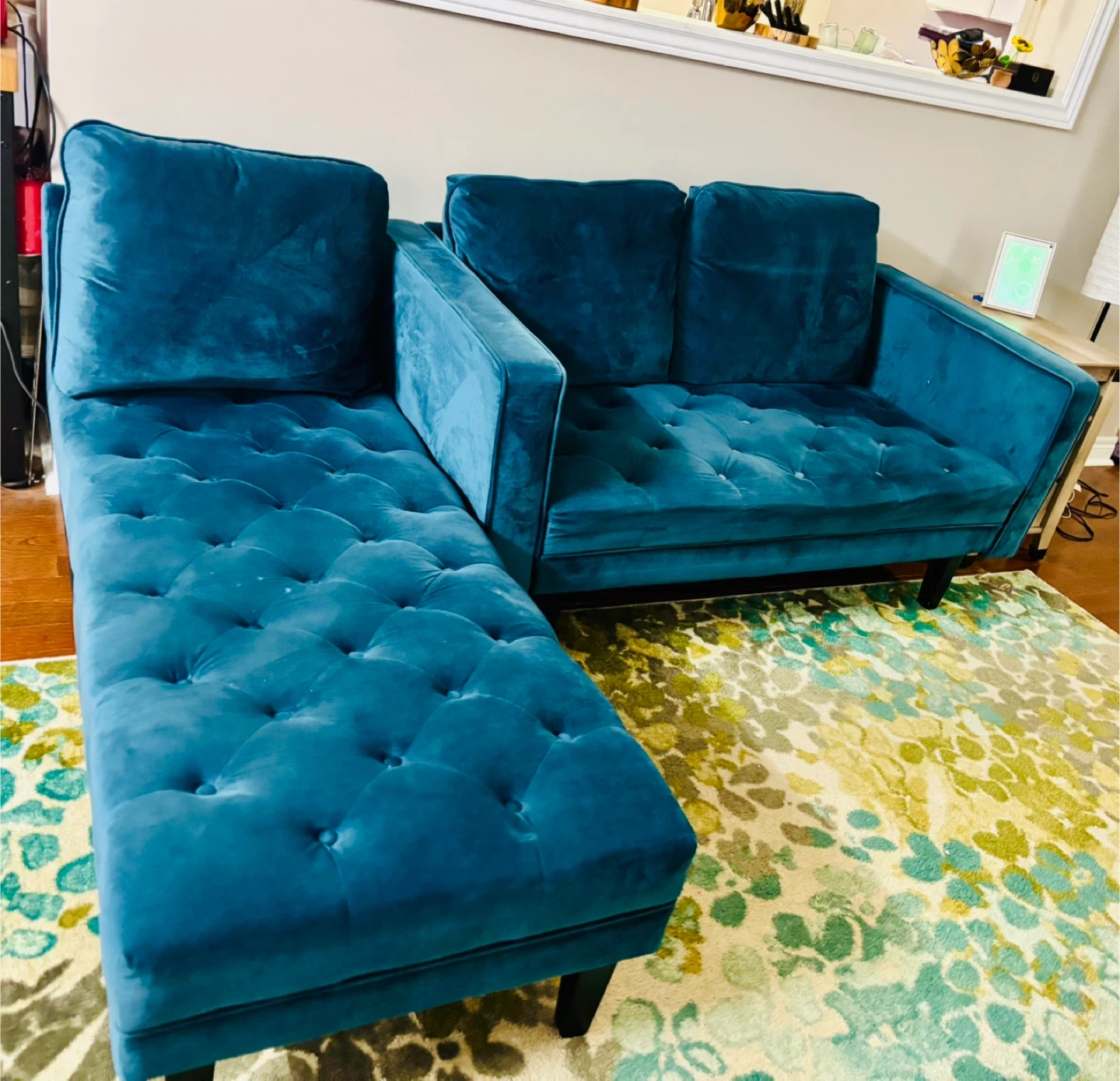 Selling a beautiful blue velvet sectional sofa. It features a tufted design and is in great condition. Perfect for adding a touch of elegance to your living room! As of now the sectional is not attached, just placed to the side.
