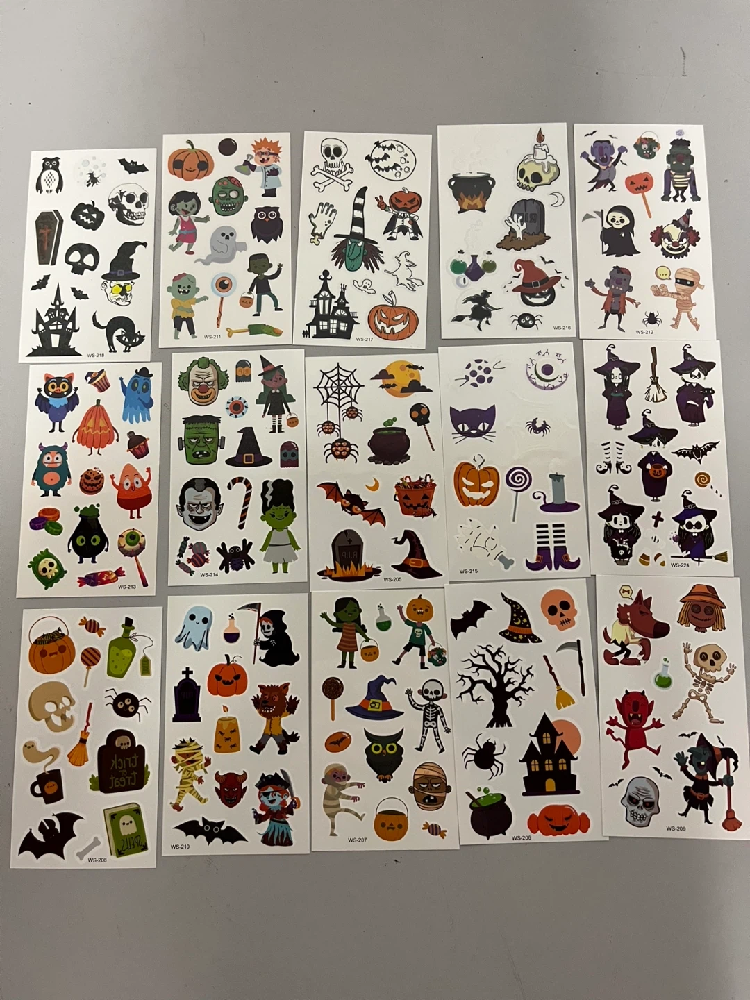 Get ready for Halloween with these fun temporary tattoos! There are lots of different spooky designs to choose from, like ghosts, pumpkins, witches, and skeletons. Perfect for parties, costumes, or just adding some Halloween flair! 11.5 cm x 6cm Each pack contains 39–40 cards featuring 15 different designs, with varying quantities of each design. Pick up at steeles and Victoria park ave