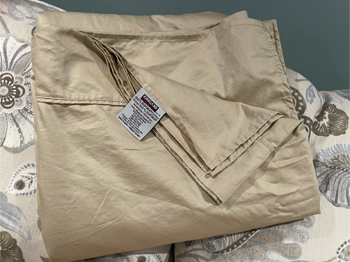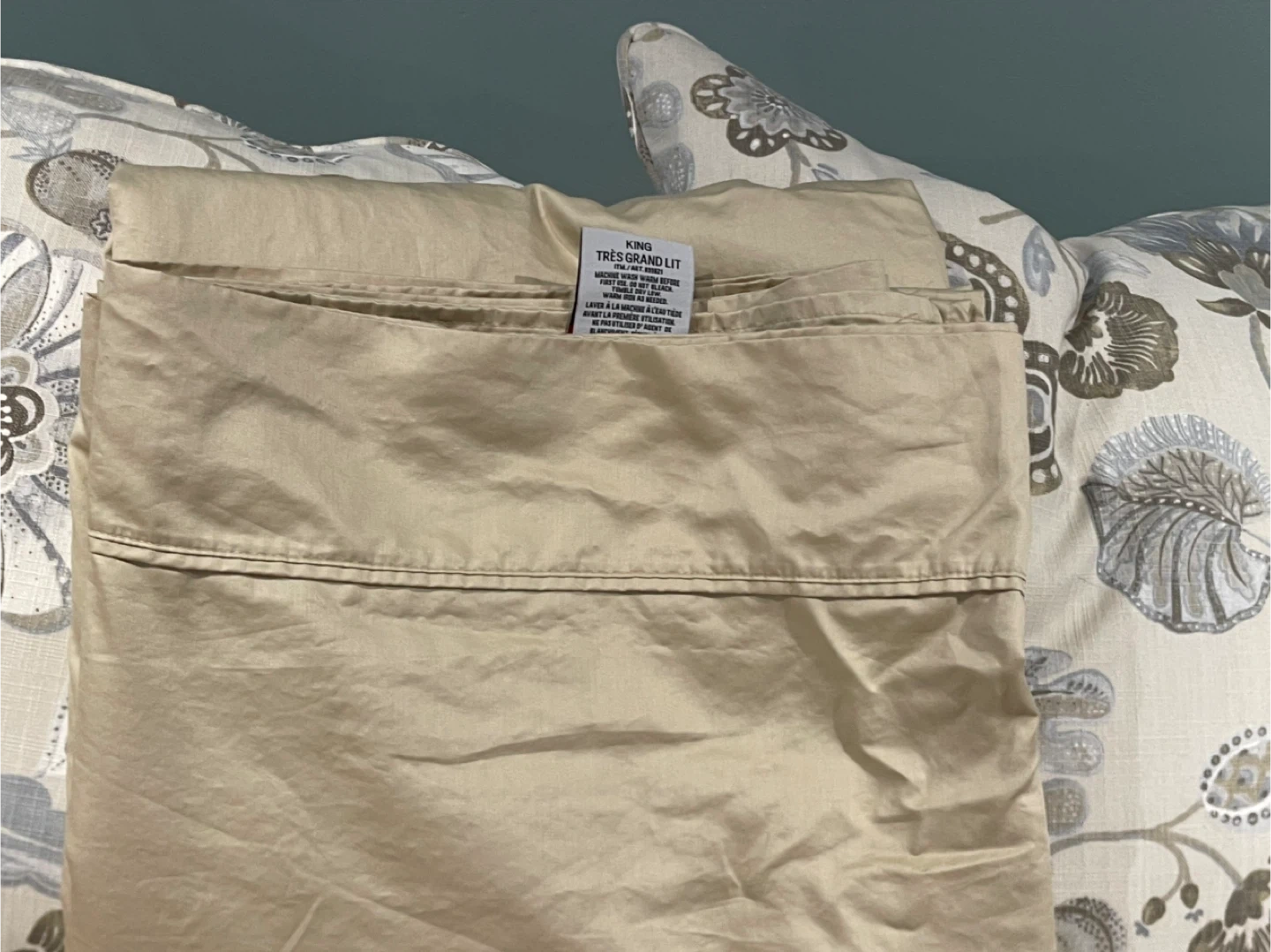 King size Kirkland Signature sheet set in a neutral colour. The set includes a fitted sheet, a flat sheet, and two pillowcases. Made of 100% cotton sateen, these sheets are soft and comfortable for a good night's sleep. Not used. Only washed for a test run on a softness of the sheets