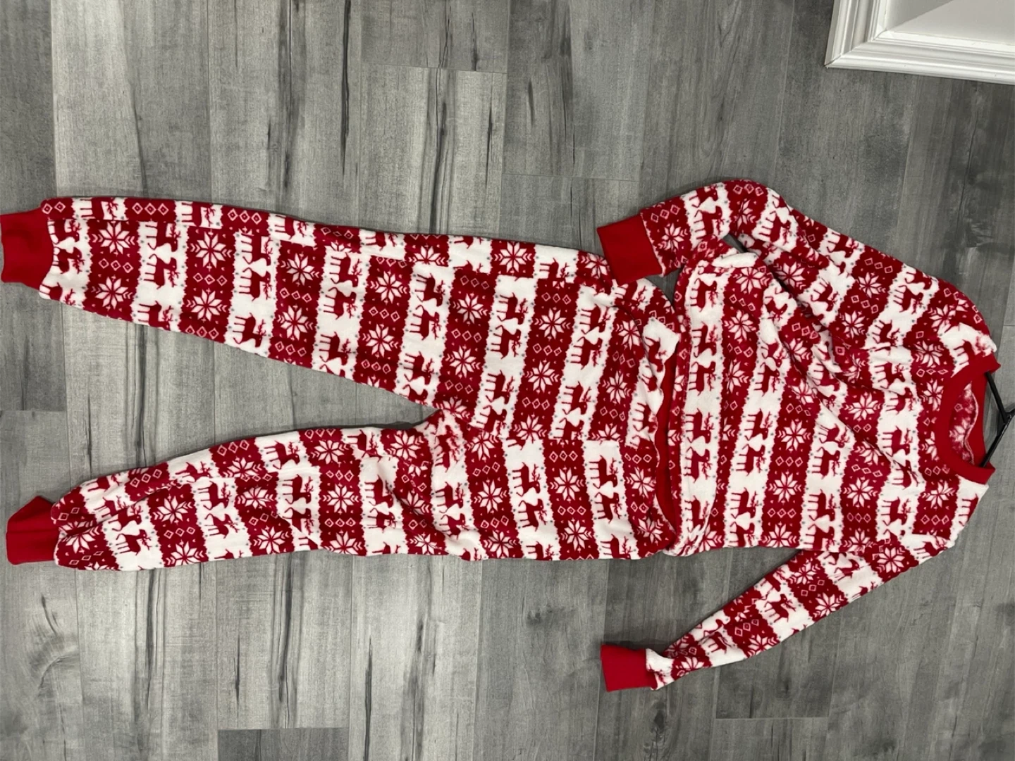Cozy up this winter with these adorable red and white Christmas pajamas! They feature a festive Christmas pattern with reindeer and snowflakes. Perfect for lounging around the house during the holidays! Size: Small