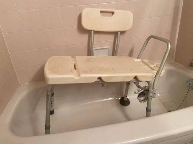 This is a used bath transfer bench designed to assist individuals with mobility issues in transferring in and out of the bathtub safely. As this item is used, it does have some wear. Here are some features: * Adjustable height * Sturdy aluminum frame * Weight capacity: 300 lbs This bath transfer bench offers a blend of safety and convenience.
