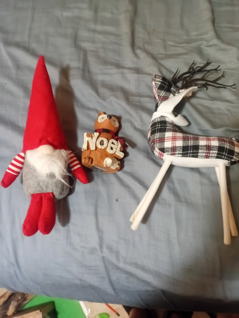 Selling these adorable Christmas decorations! There's a cute gnome with a red hat, a plaid deer, and a little bear holding a 'Noel' sign. Perfect for adding some festive cheer to your home this holiday season