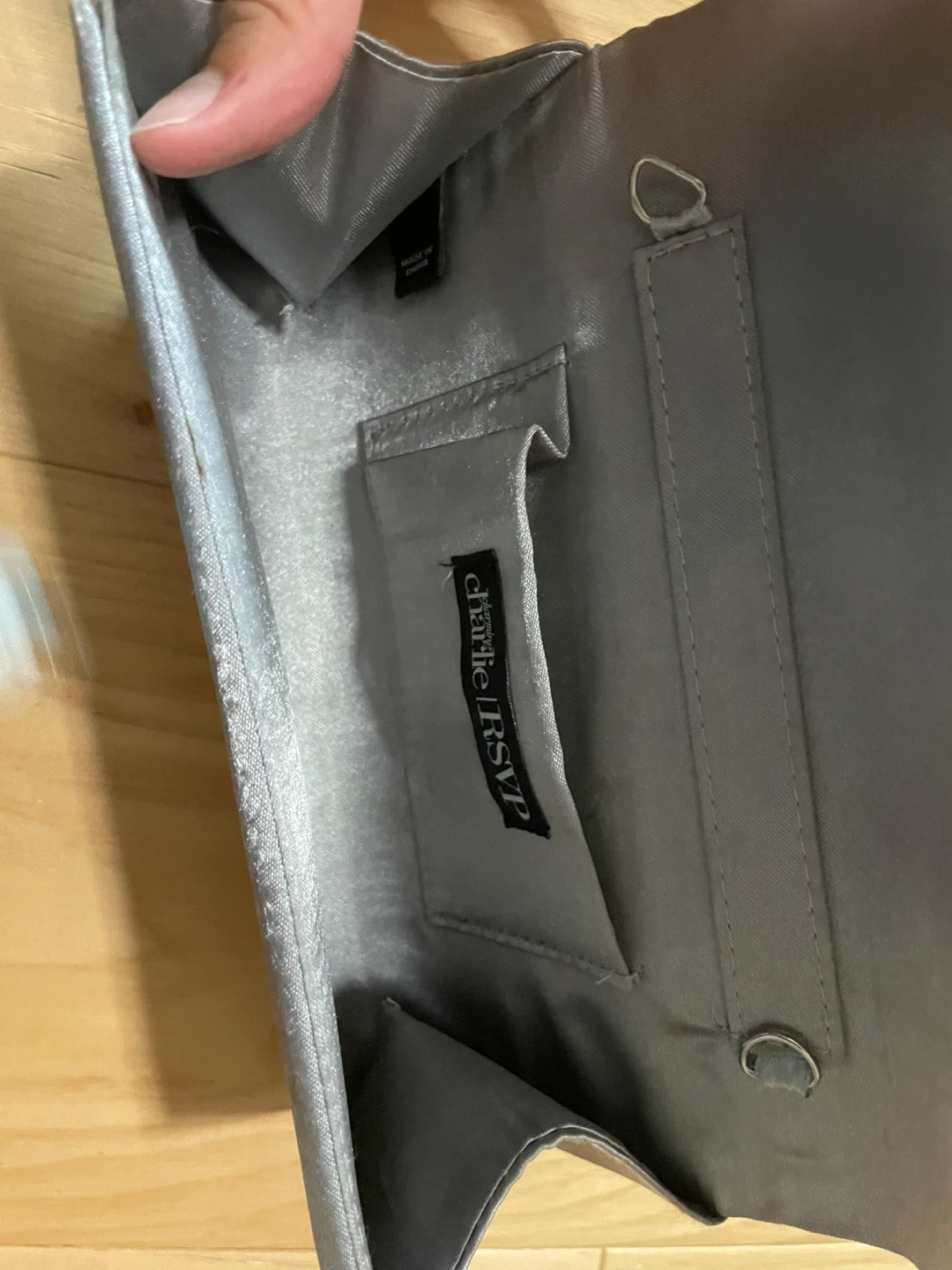Selling a beautiful silver clutch from Charlie RSVP. It's in great condition and perfect for evenings out or special occasions. The clutch has a unique design and a sleek, elegant look. It's a great accessory to complete your outfit!