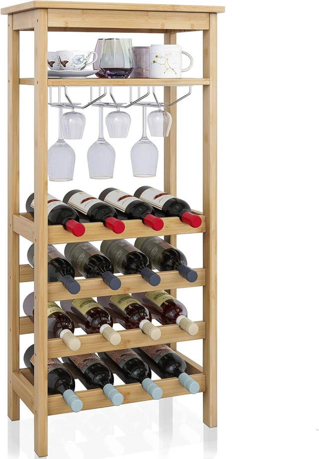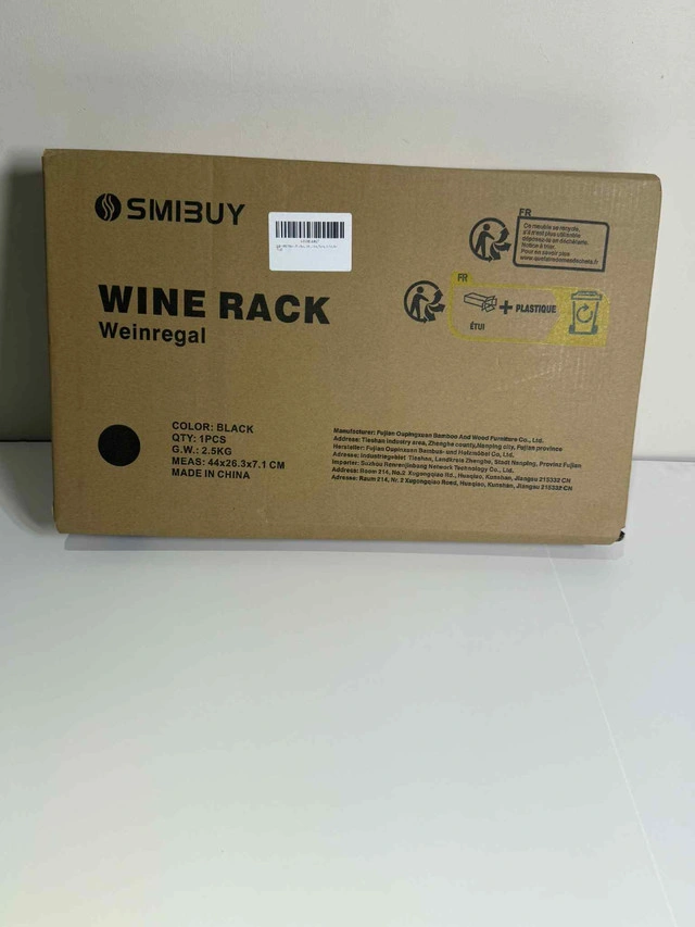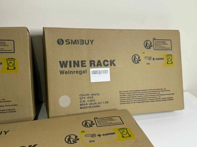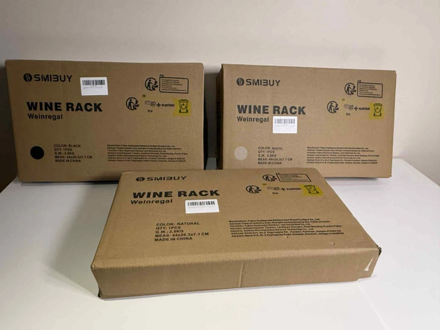 Brand-New SMIBUY Bamboo Wine Rack — freestanding, holds 16 bottles + 6–9 glasses with a tabletop surface. Highlights: Choice of 3 colours: White, Black, Natural Durable 100% bamboo, sturdy & wobble-free Easy assembly with included tools Secure bottle tilt design keeps corks moist Perfect for kitchens, dining rooms, basements, or bar setups Condition: Brand New — boxed & ready. Contact: Message here or call/text 289-788-8085.