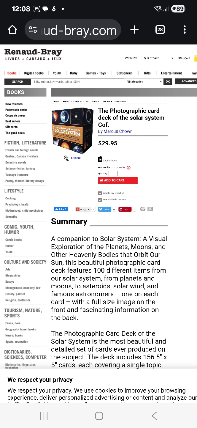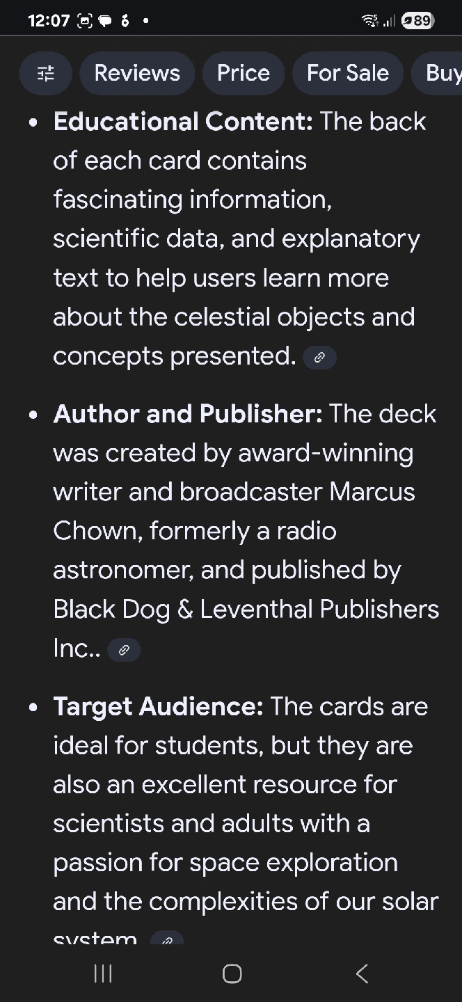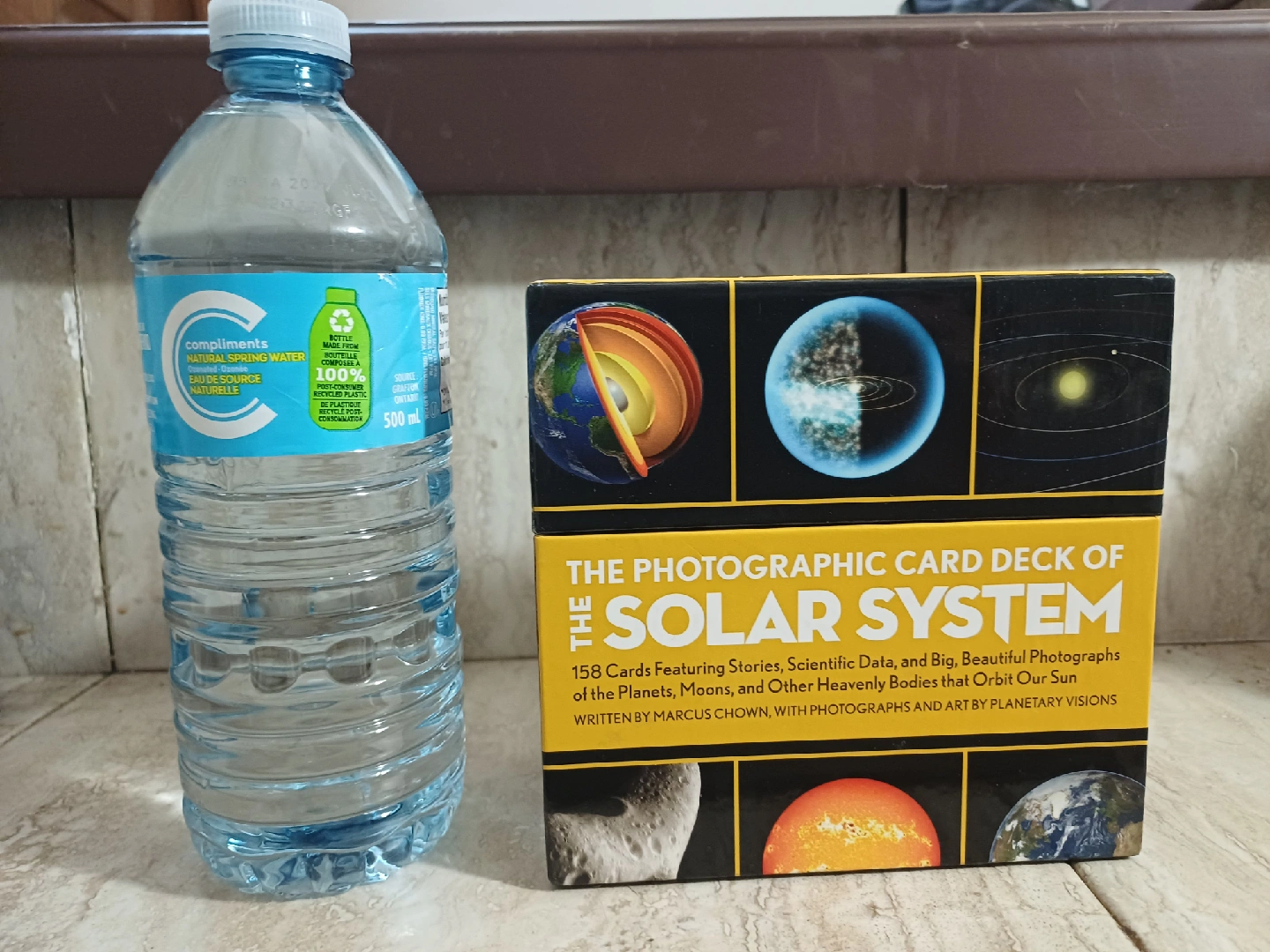 "The Photographic Card Deck of The Solar System" by Marcus Chown with photographs and art by Planetary Visions It features 158 cards with stories, scientific data, and big, beautiful photographs of the planets, moons, and other heavenly bodies that orbit our Sun It is a unique and beautiful photographic card deck that takes you on a trip across time and space. Photographs shows the EARTH card has slight damage that I will try to repair