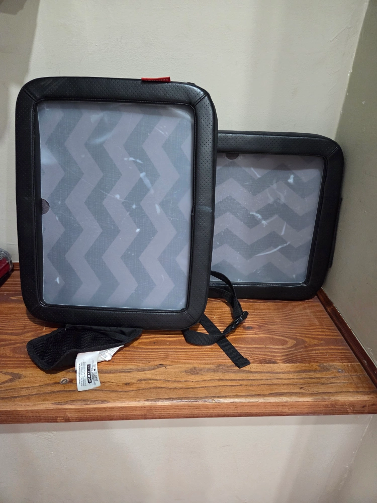 A multipurpose car seat tray for endless hours of play in the car! Perfect for projects on the go, the chic chevron print and fashionable faux leather coordinate with any car interior. A removable wipe-down insert creates the perfect smooth surface for travel. The insert can be used as an art or reading station—or for snacks! Features: Chic chevron print and fashionable faux leather details Raised edges keep items contained Removable, wipe-down insert Side pocket for crayons, markers, toys and more Foam construction with no sharp edges Adjustable strap fits around car seat Size (inches): 14.5l x 11.75w x 2h; (cm): 37l x 30w x 5h