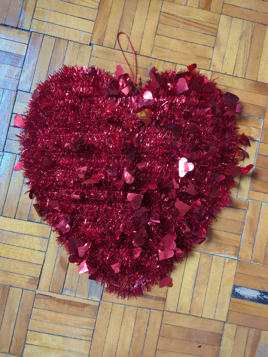 A festive red tinsel heart decoration! Perfect for Valentine's Day or adding a touch of love to any room