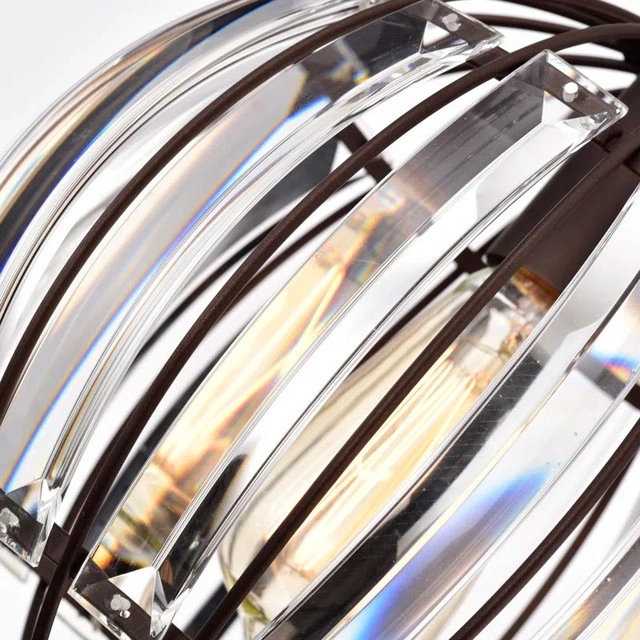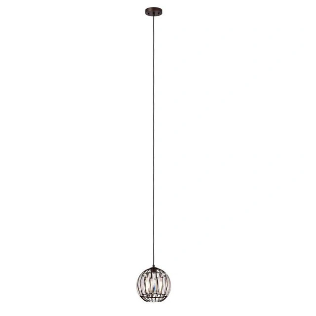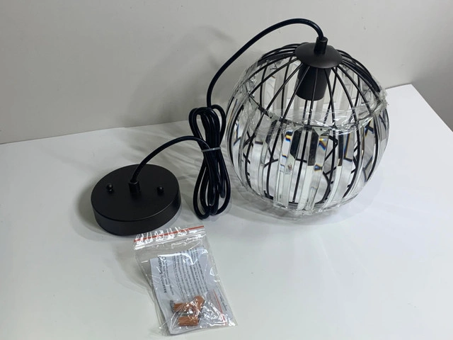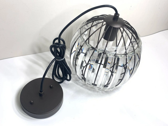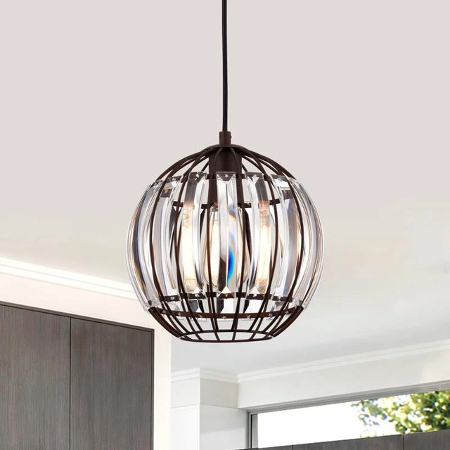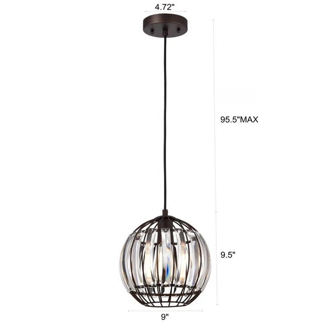 The Vanhorn pendant brings warmth and elegance to any room with its oil-rubbed bronze finish and stunning globe-shaped crystal glass. A perfect addition to kitchens, hallways, or reading nooks, it delivers focused downlight in a classic transitional style. Key Features: Compact single pendant with downward light direction. Uses 1 x 100W E26 bulb (LED, incandescent, or fluorescent compatible) Globe-shaped clear crystal glass for clean, uninterrupted light. Oil-rubbed bronze finish and sloped ceiling compatible. UL listed and dry-rated – ideal for indoor spaces. Condition: New
