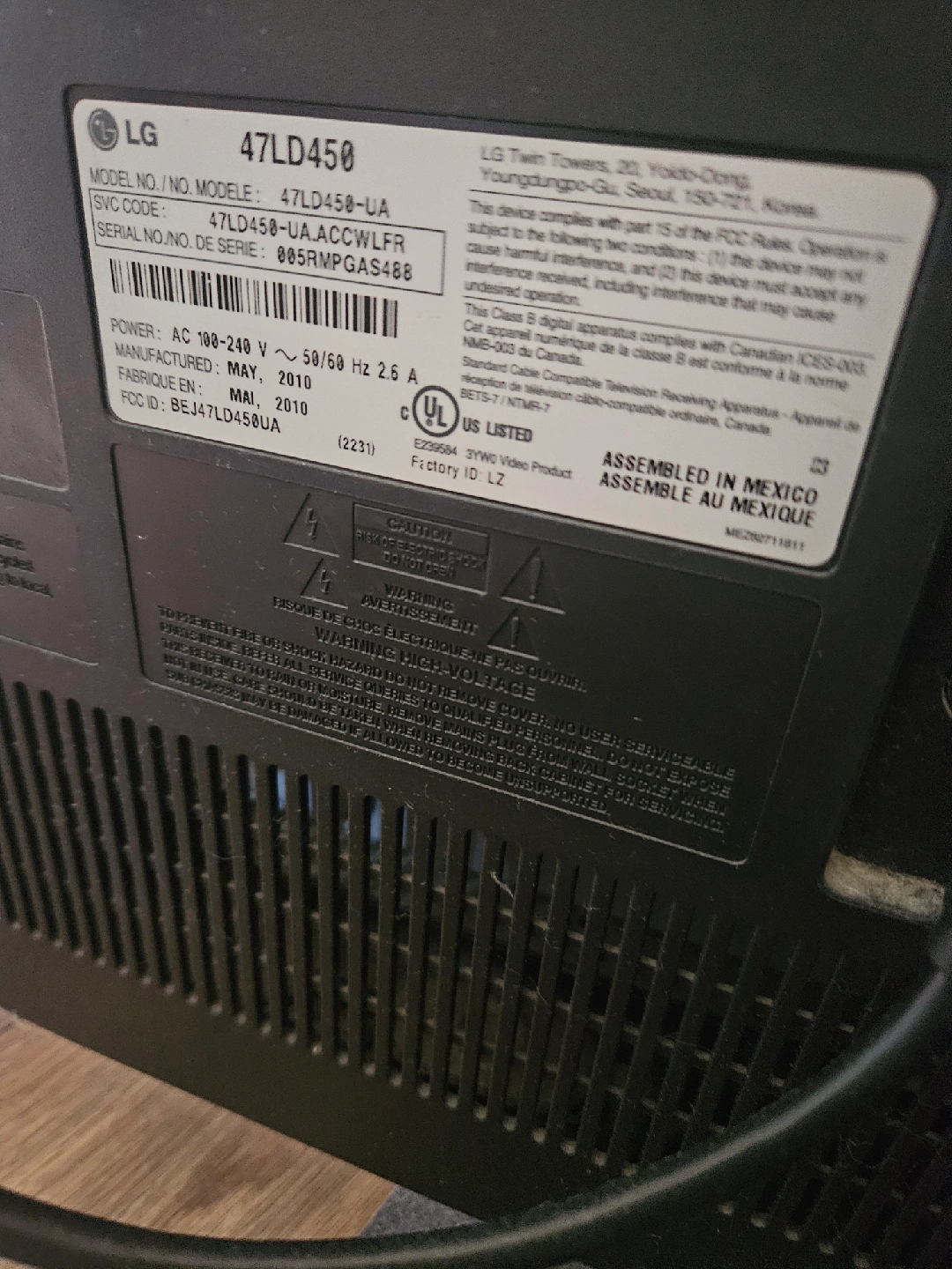 Selling an LG 47LD450 47 inch TV. It's in good working condition. Manufactured in May 2010. Includes remote. must pick up. Will be brought to Value Village this evening if not picked up.