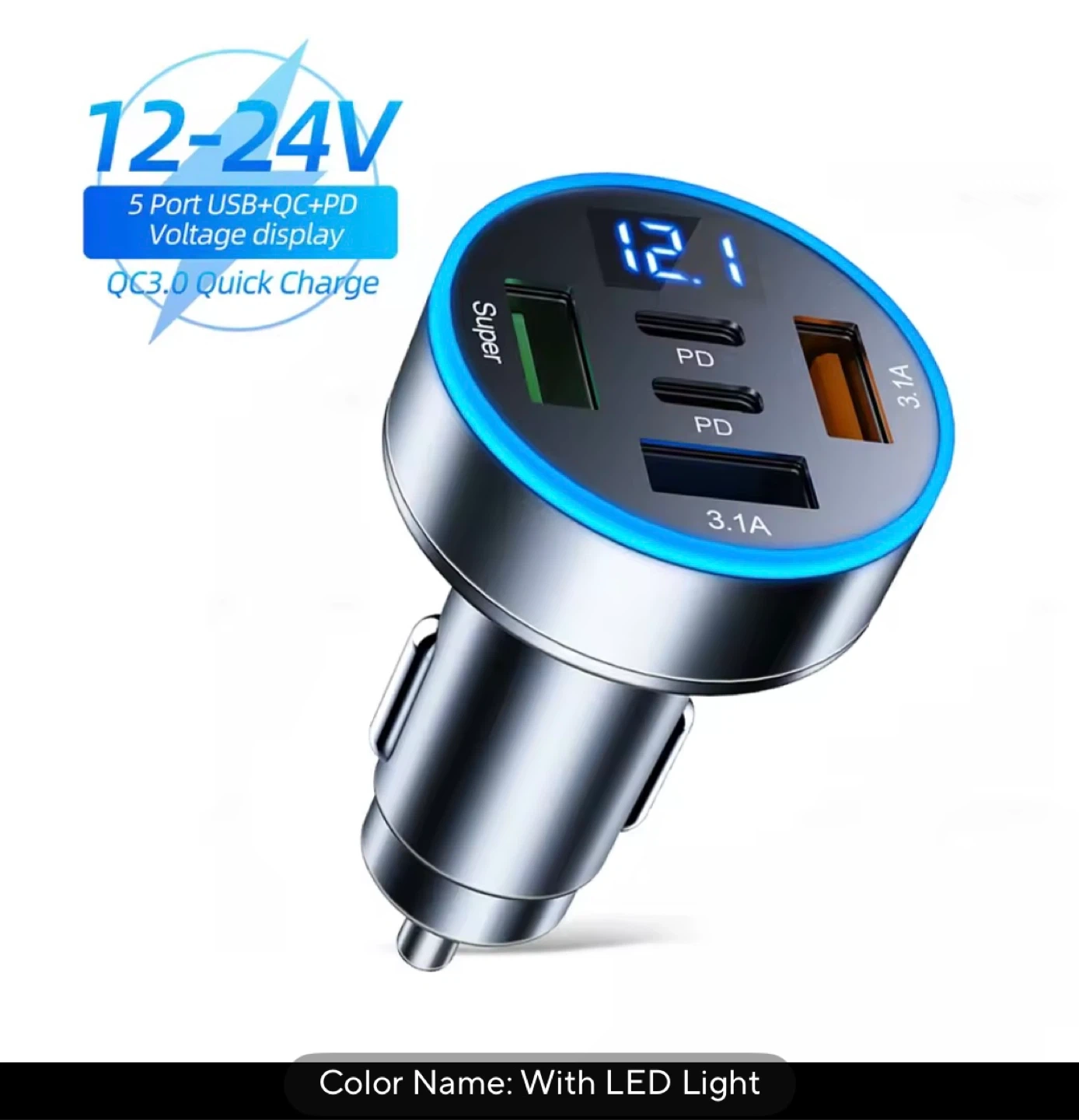 Car charger with 5 ports, USB+QC+PD voltage display, and QC3.0 quick charge. It supports 12-24V.