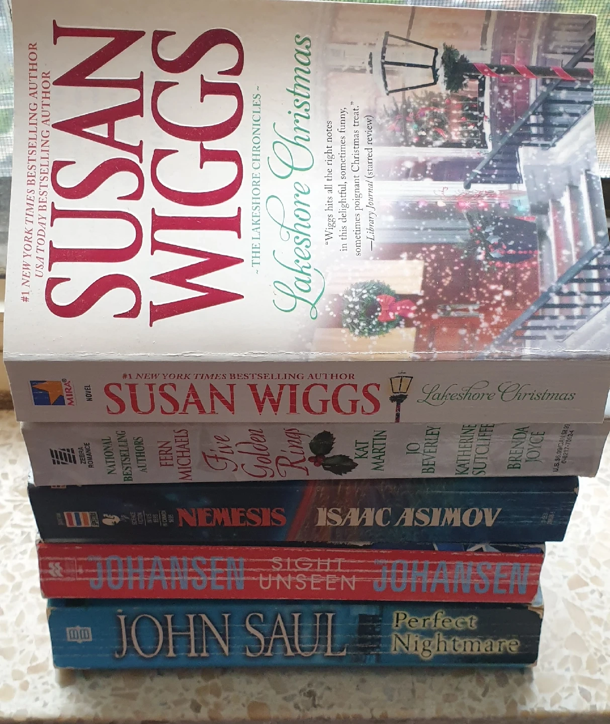 Selling a lot of various books, including: - Susan Wiggs - Lakeshore Christmas - Fern Michaels - Five Golden Rings - Isaac Asimov - Nemesis - Johansen - Sight Unseen - John Saul - Perfect Nightmare All for 5$
