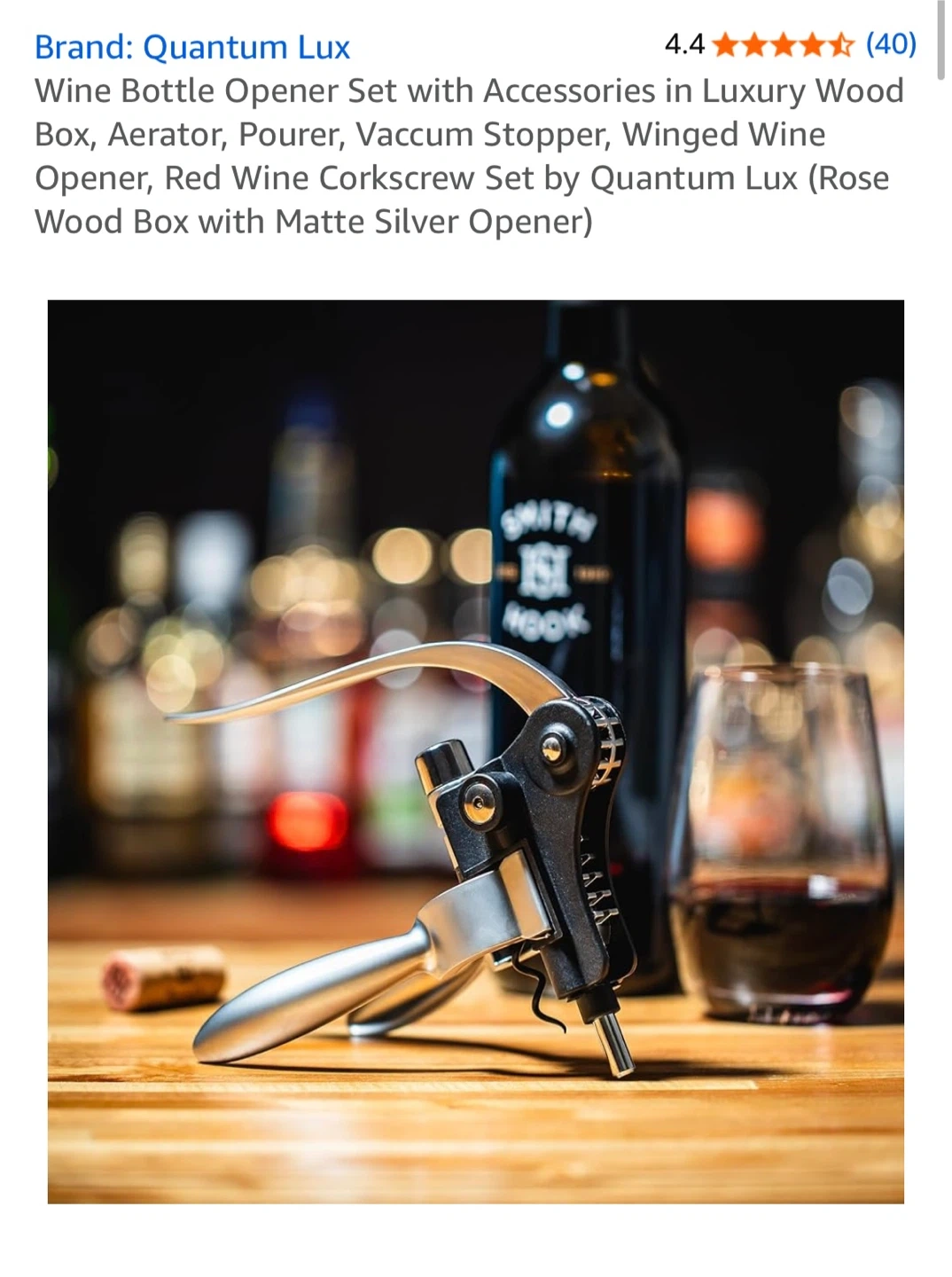 Looking to sell this Quantum Lux wine bottle opener. It has a winged wine opener and red wine corkscrew set. Great for any wine lover! Still brand new .