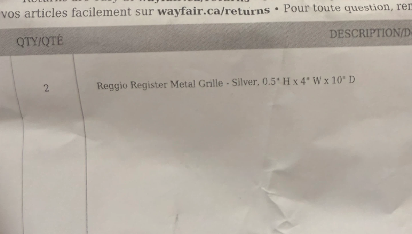 Selling two brand new Reggio Register metal grilles/vent covers in silver! It's 0.5" H x 4" W x 10" D. Comes with the owner's manual and original packaging.