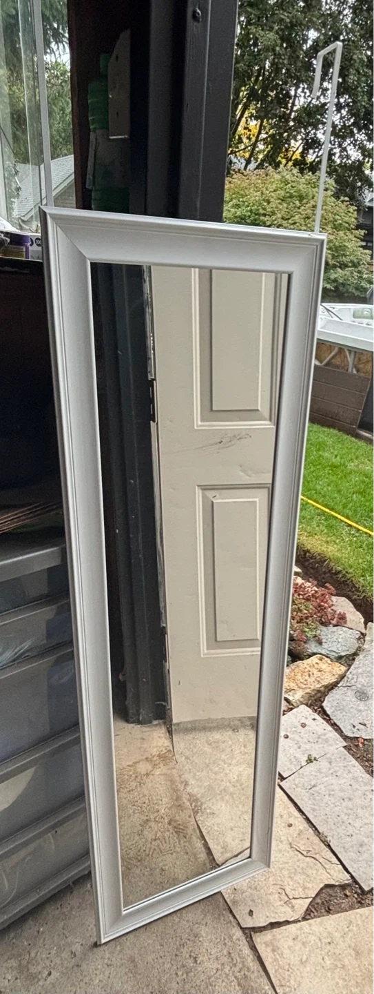 Selling a nice framed mirror with a clean white frame. It's in great condition and ready to brighten up any room. Perfect for adding a touch of elegance to your space! Has hooks at the top easy to hang on any regular sized door