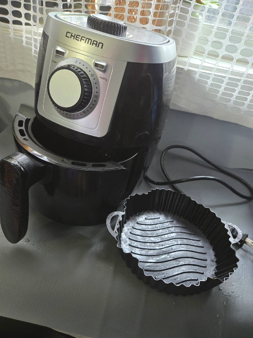 Selling a Chefman TurboFry 1.9L Air Fryer. It has a 1.9-litre basket capacity, dishwasher-safe basket/rack, intuitive dial control, and auto shutoff for safety. Specs include 1000W/120V, 80°C to 200°C, 19 x 28 x 27.3 cm, and a 60-minute timer Great working condition No delivery Serious inquiries only