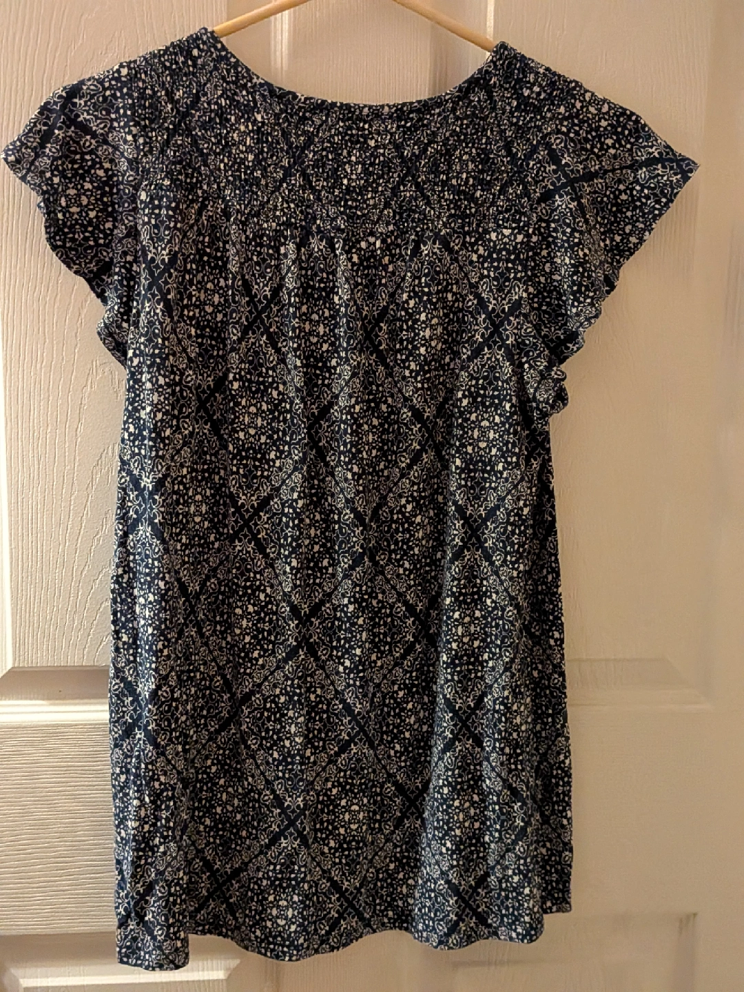 This is a cute Old Navy smocked top in size medium. It features a navy and white pattern. It's in great condition and ready for a new home! Pickup location Oxford and Wonderland FCFS cross posted please checkout my other listings