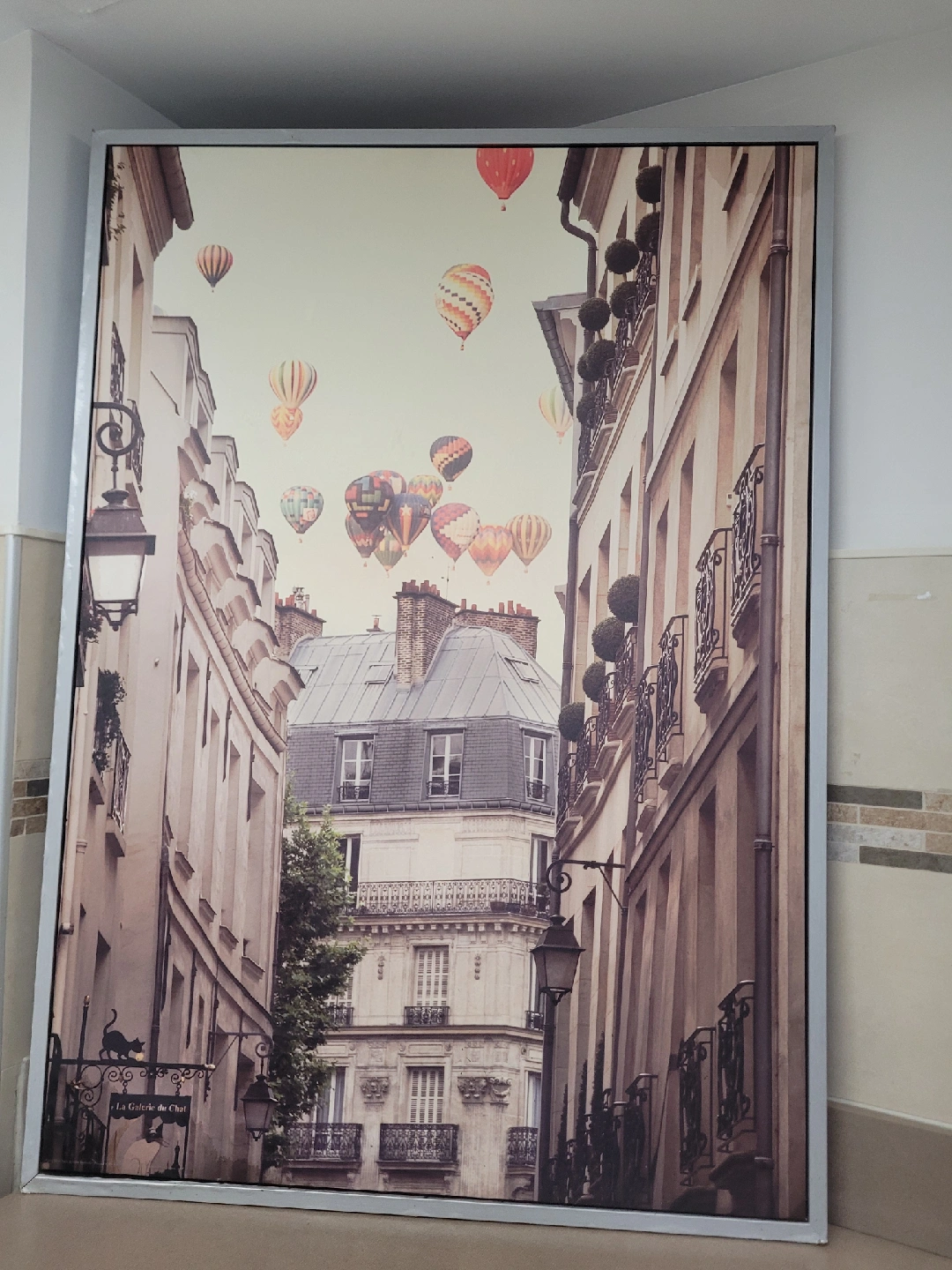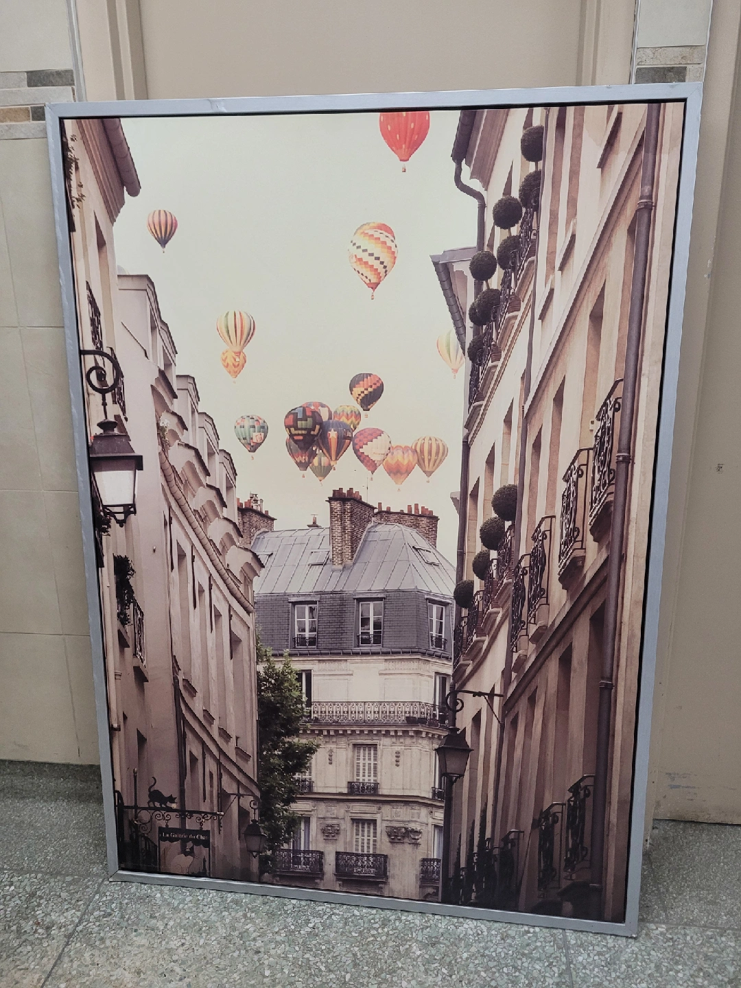 Add a touch of Parisian charm to your home with this IKEA Vilshult artwork, showcasing a beautiful street scene with hot air balloons. This large piece measures 140x100 cm (55x39 inches) and makes a striking statement. It is in fair condition, with some visible wear on the edges, as shown in the photos. Perfect for adding character to any room! I am asking for a reasonable price considering the minor damage. It's a piece that whispers tales of travel and adds a certain 'je ne sais quoi' to your space. Don't let this beauty float away! And hey, if the ad's still up, the artwork is still waiting for you to give it a new home. Contact me anytime!