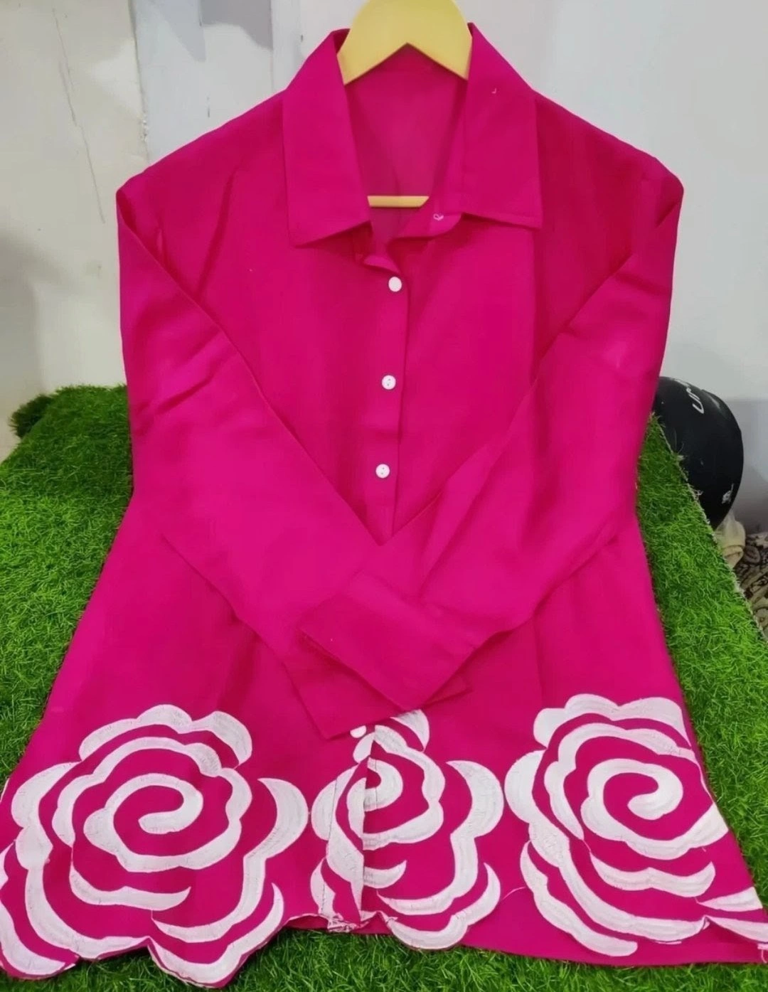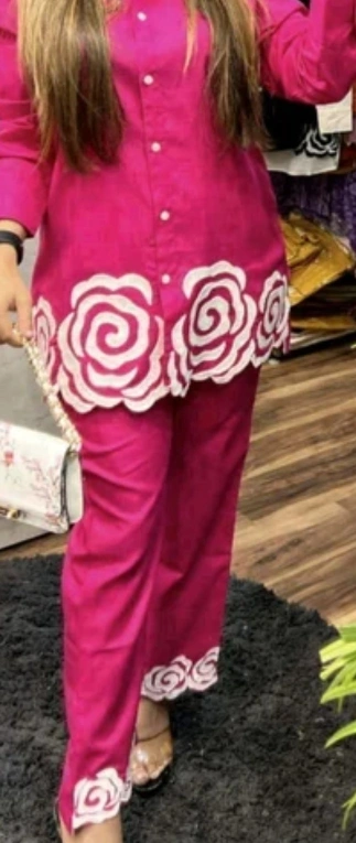 Selling a beautiful pink ladies' suit with a unique rose design. This suit is perfect for a special occasion or a stylish everyday look. The colour is a vibrant pink, and the rose design adds a touch of elegance.