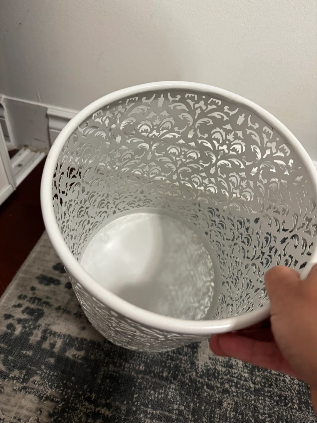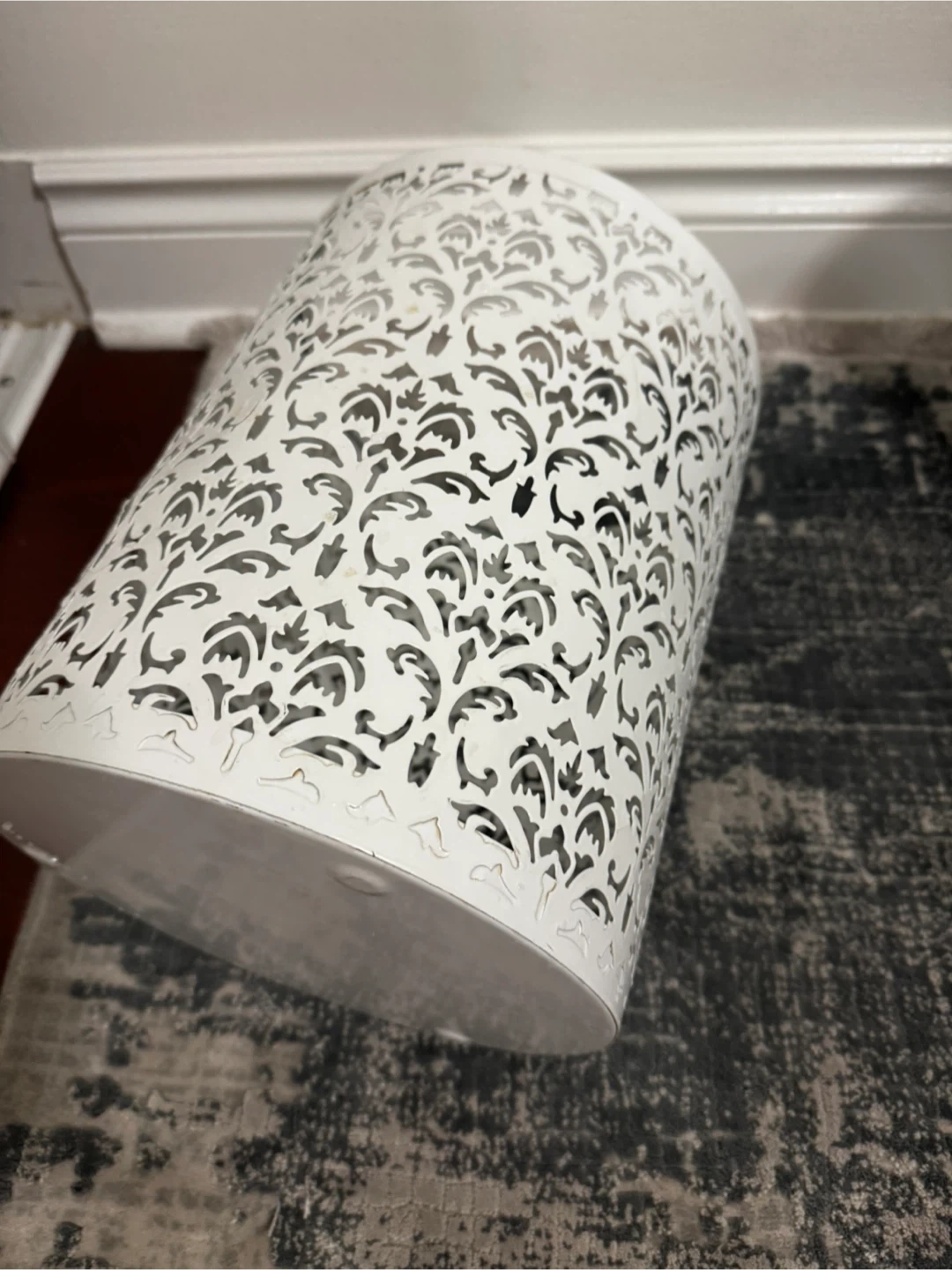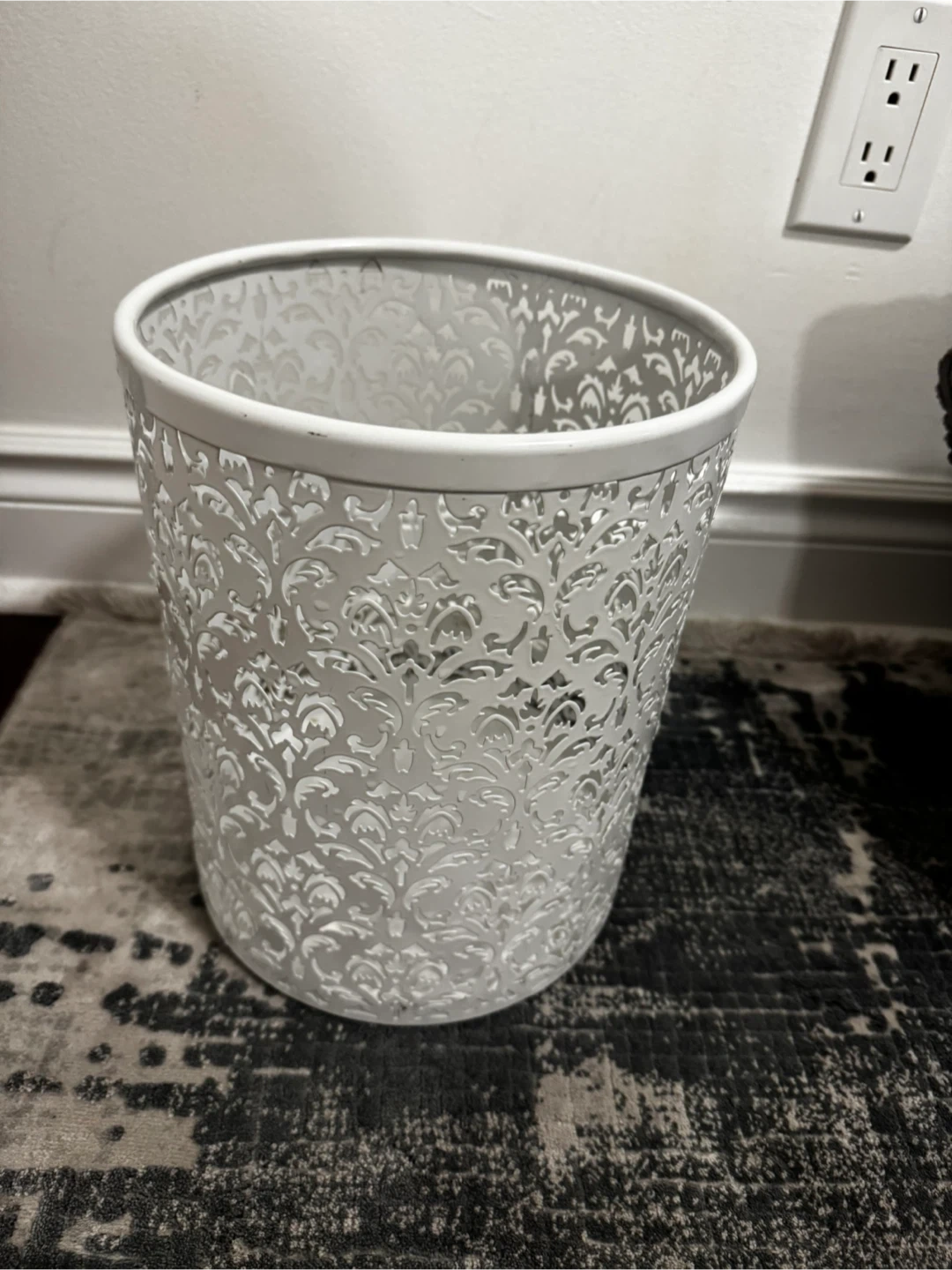 Here's a cute white metal wastebasket with a decorative cutout design! It's perfect for adding a touch of elegance to any room in your home Like new $5 Yonge and finch area