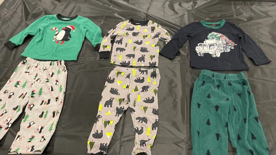 EUC- 3T jammies: Pic 1- Footed PJs- $4 per pair (Dino pair on farthest left is SOLD) Pic 2- Two-piece PJs- $4 per pair (X-MAs tree truck on far right SOLD) Queensway & Islington