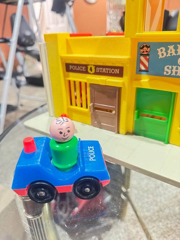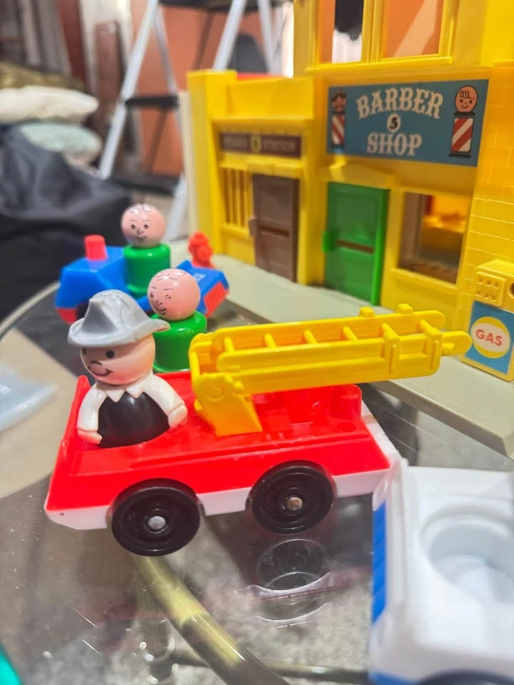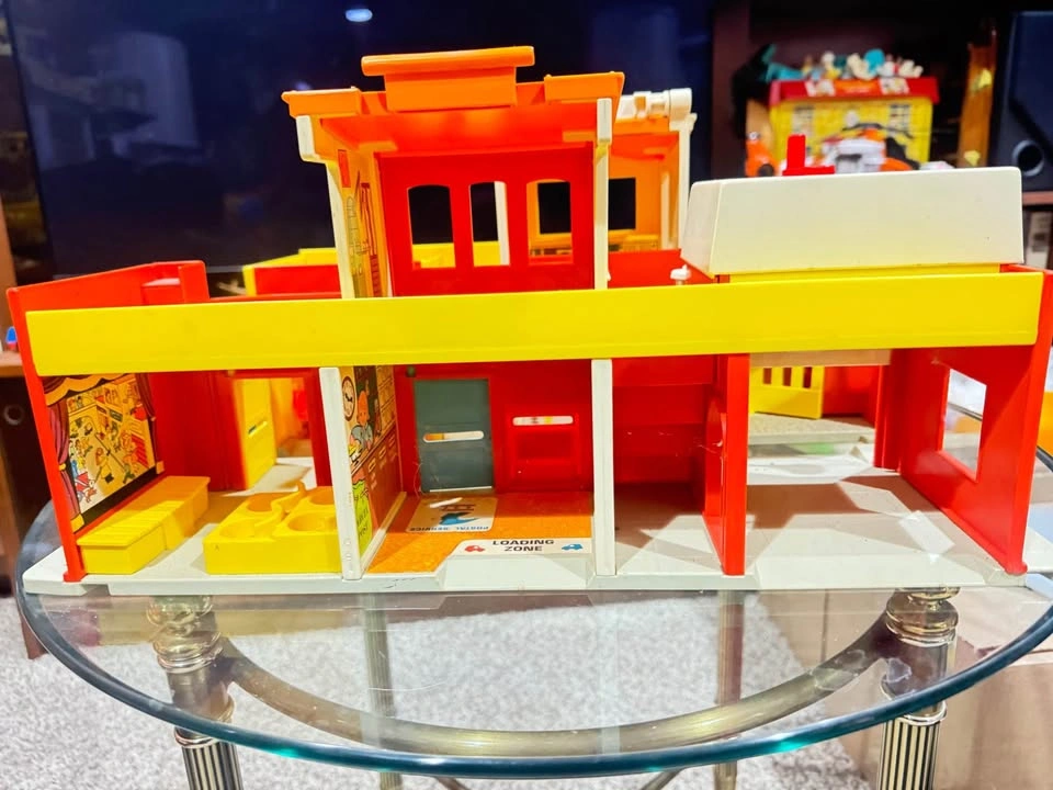 This colourful vintage Fisher Price Village has plenty of retro play value. Suitable for children or collectors. Three vehicles and drivers included. We do have the original box as well, although it is not in very good condition. Cash only please. No holds. Birchmount and Kingston Road area.