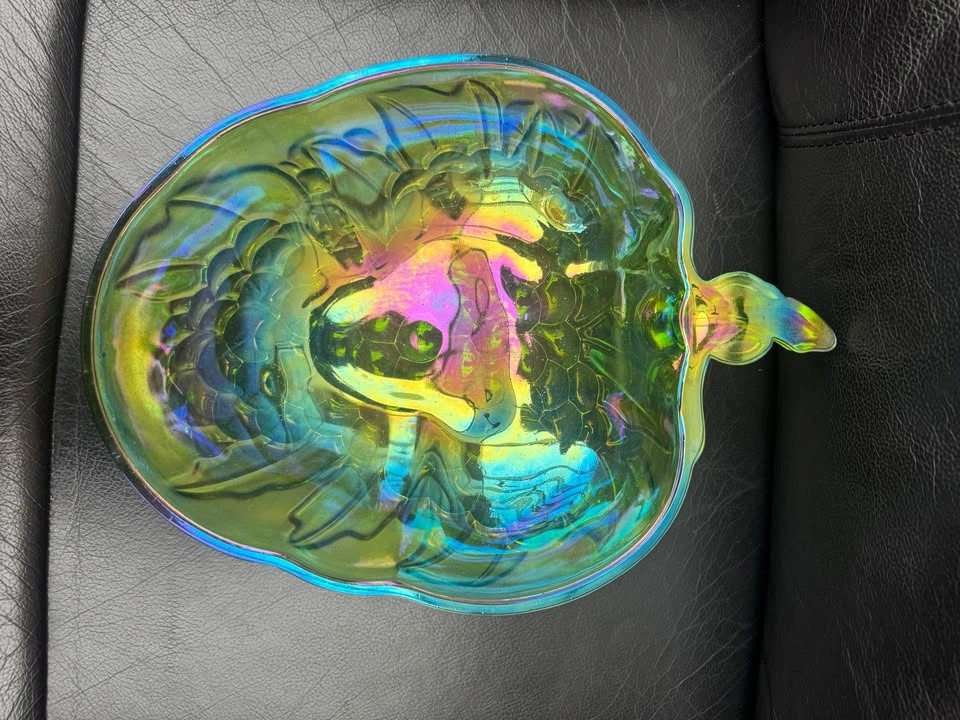 Beautiful vintage carnival glass serving dish, approximately 3" deep, 12 inches long and 9 inches at its widest point. Grape motif. Pick up is available in the Birchmount Road in Kingston Road area.