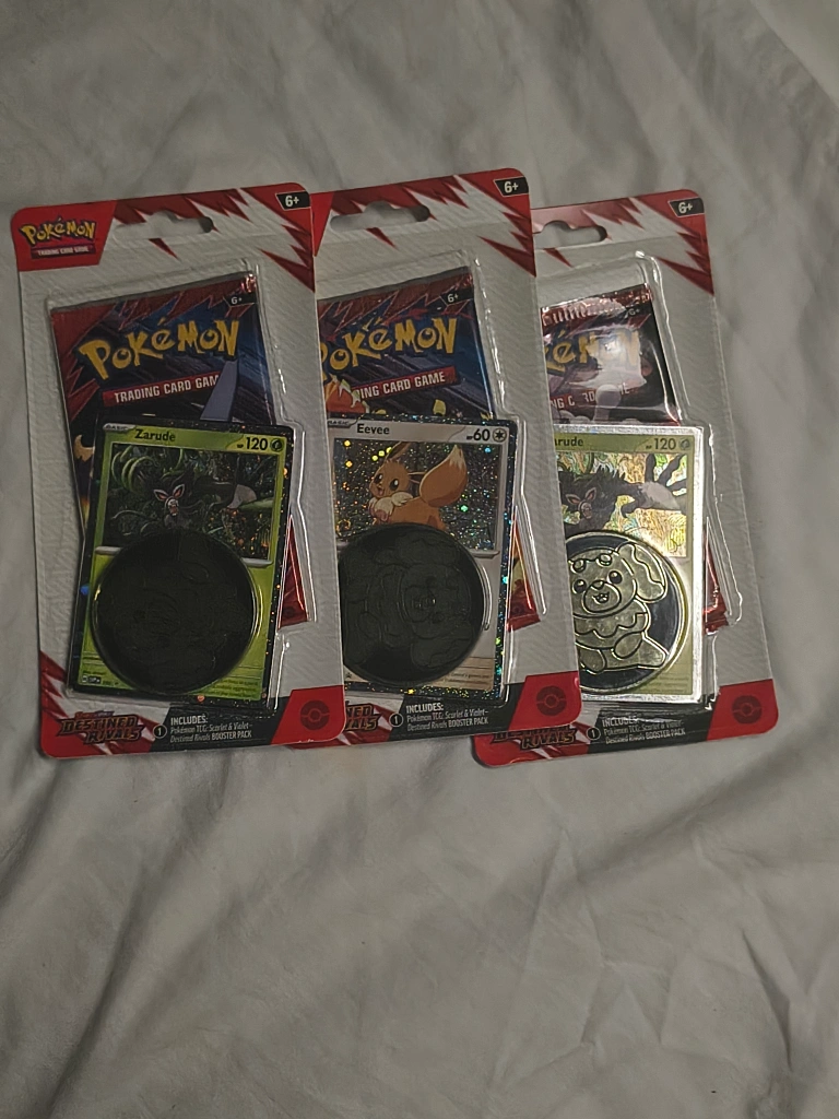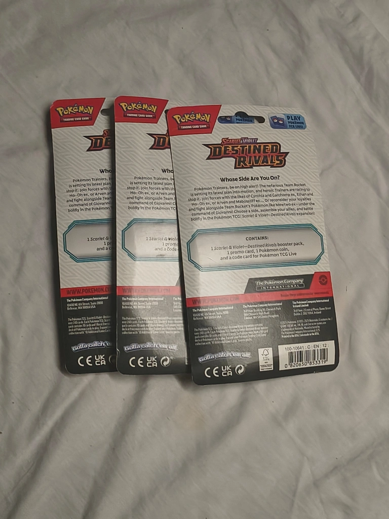 Selling three Pokemon TCG Scarlet & Violet Destined Rivals booster packs. Each pack includes: - 1 Scarlet & Violet - Destined Rivals booster pack - 1 promo card - 1 Pokemon TCG Live code card Destined rivals New $15 a pack 3 for $40 Shipping is additional