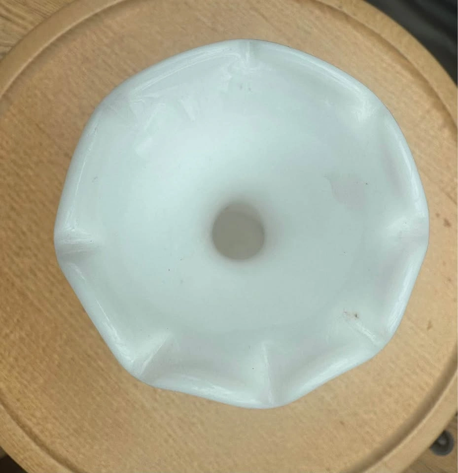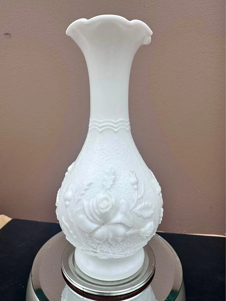 This beautiful Imperial Glass Milk Glass bud vase hails from the 1950’s or 60’s and is in excellent vintage condition. It has a delicate floral pattern of raised roses done with an impressed back stamp with a doeskin finish and a ruffled top. Made with a high quality opaque glass material, this footed vase is perfect for displaying flowers or as stand alone decorative piece. It is approximately 6 1/4 inches tall, 2 1/4 inches across the top and 3 inches in diameter at its widest point. There is an Imperial Glass mark on the bottom of the vase. Cash only please. No holds. PFSF home. Birchmount between Kingston Road and Danforth