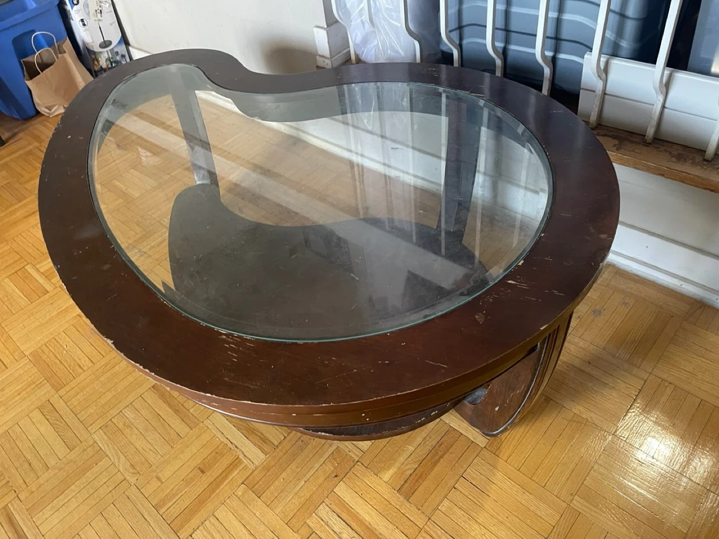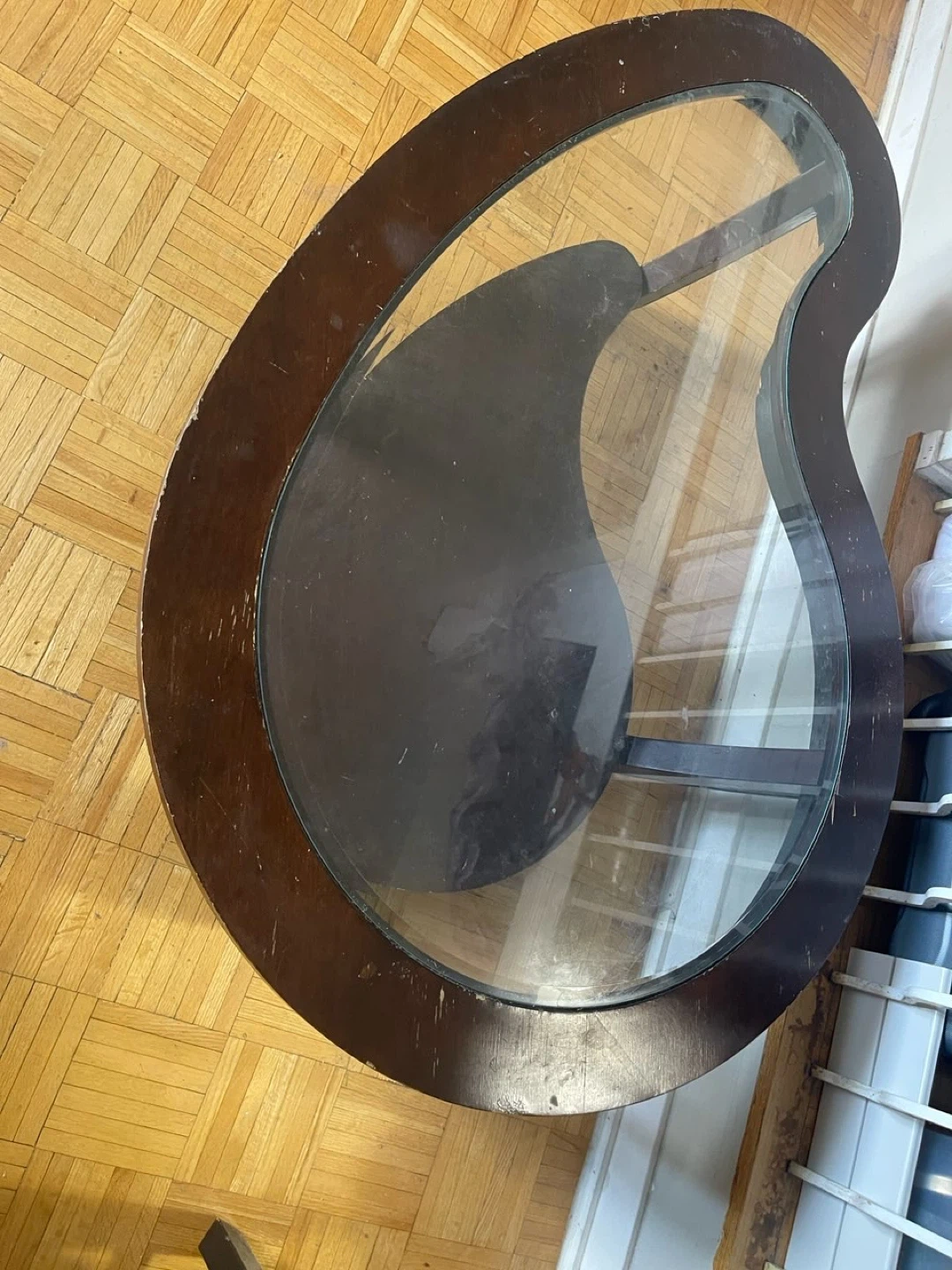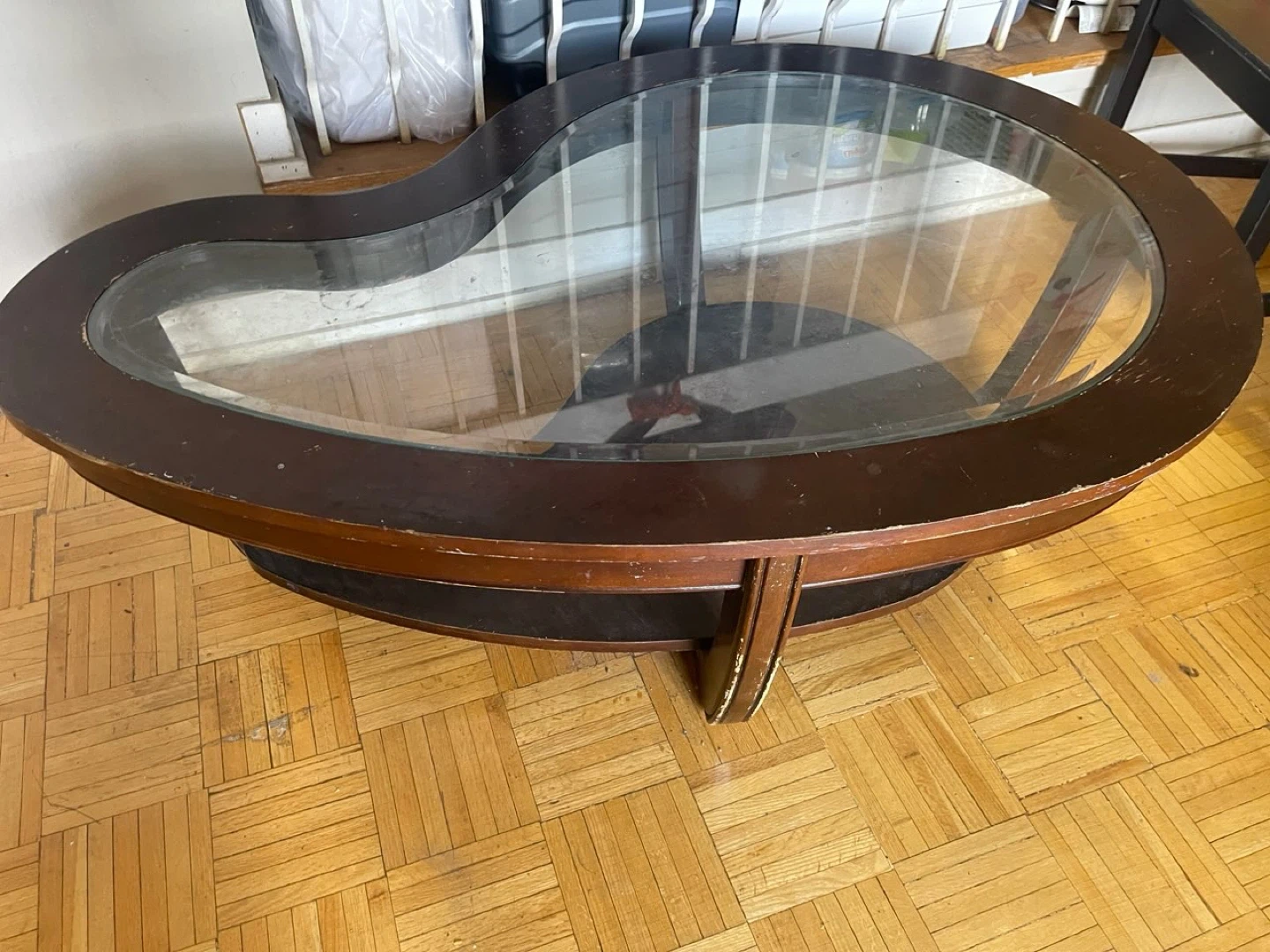Selling a unique coffee table with a kidney bean shape and a glass top! It has a dark brown wooden frame and a lower shelf for storage. It's a great conversation piece and would look lovely in any living room Pick up only Move out sale