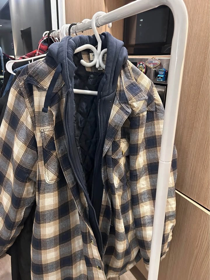 Here's a cozy hooded flannel jacket, perfect for layering! It features a classic plaid pattern in neutral tones with a contrasting dark blue hood and quilted lining. Great for adding a touch of warmth and style to any outfit