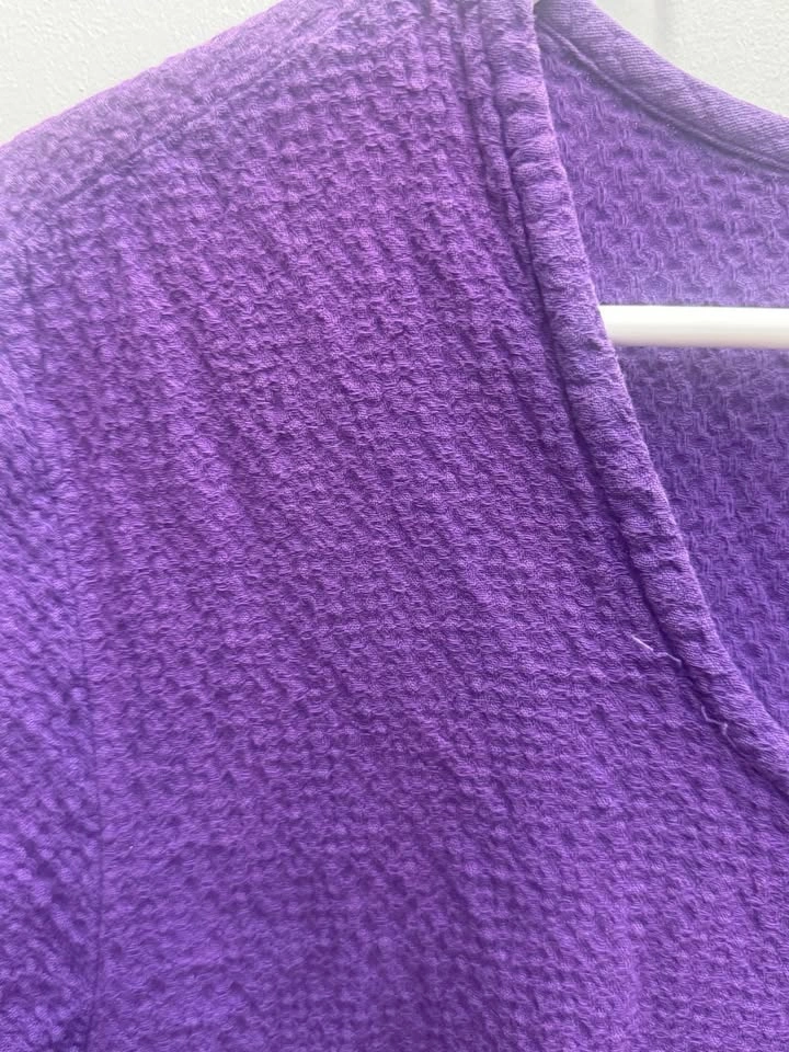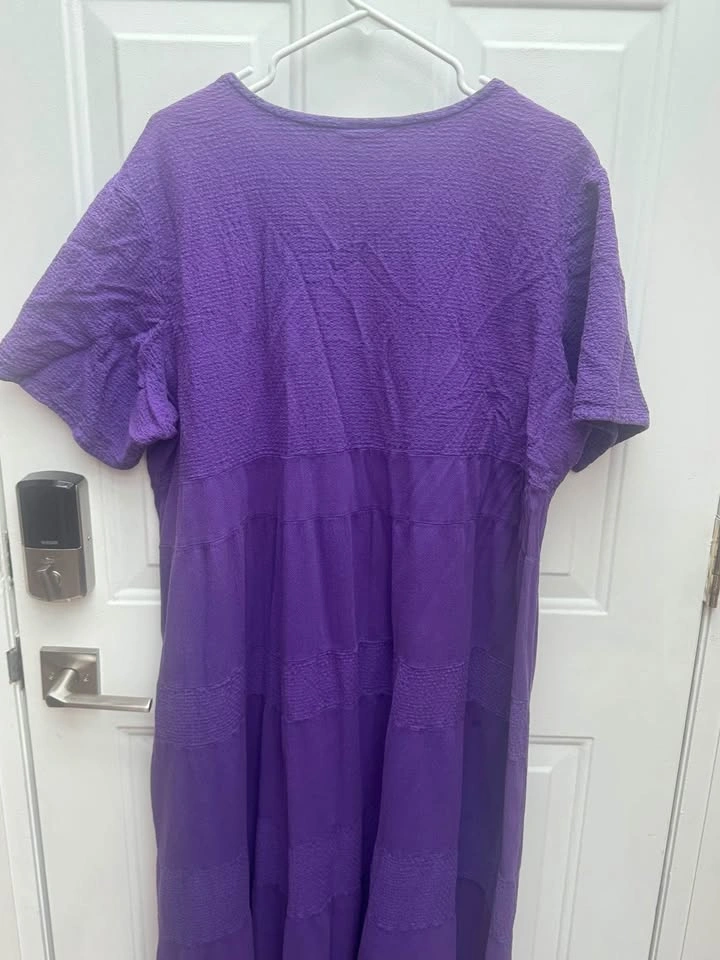 Comfortable full length 100 % cotton ladies dress in size 1X. Lovely purple colour, made by Dunes Relaxed Fashion. Ankle length, tight in the chest area, loose from waist to bottom, round neck, short sleeve, horizontal stitched detail along the length of the dress. Measurements per the website: 1X = Bust 42.5-45 inches, Waist 48 inches, Hips 48.5-51 inches Simple cool comfort for poolside, beach or casual wear. Machine wash and dry. Cash only please. No holds. Birchmount and Kingston Road area.