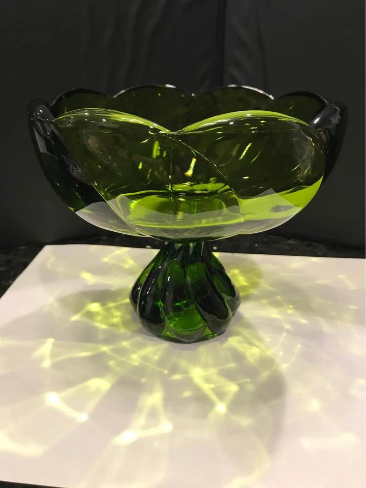 Beautiful vintage green glass serving dish, perfect for your Christmas treats or candies. Quality heavy glass that captures and reflects lights beautifully. Perfect gift or home decor item.