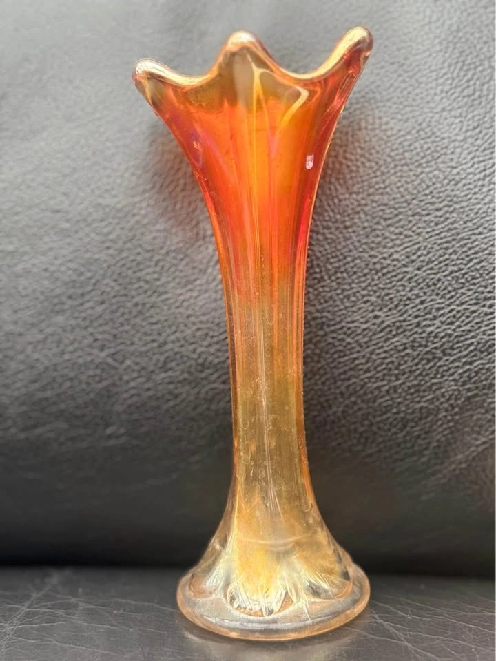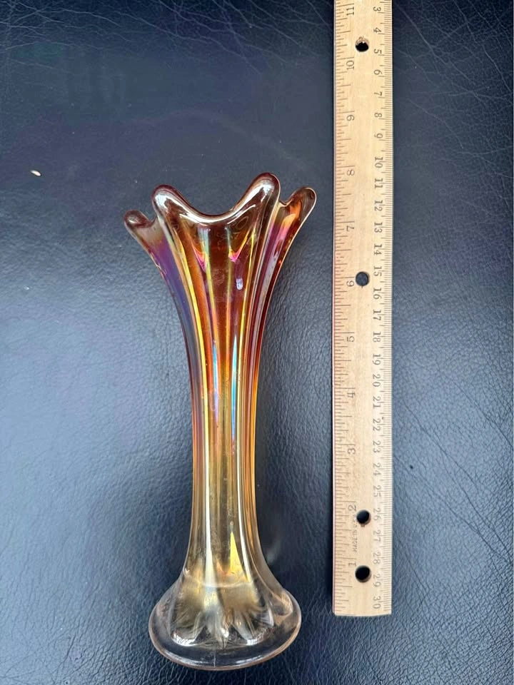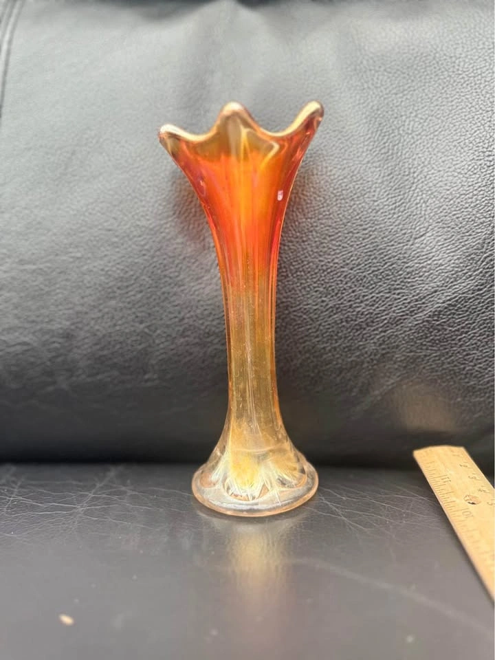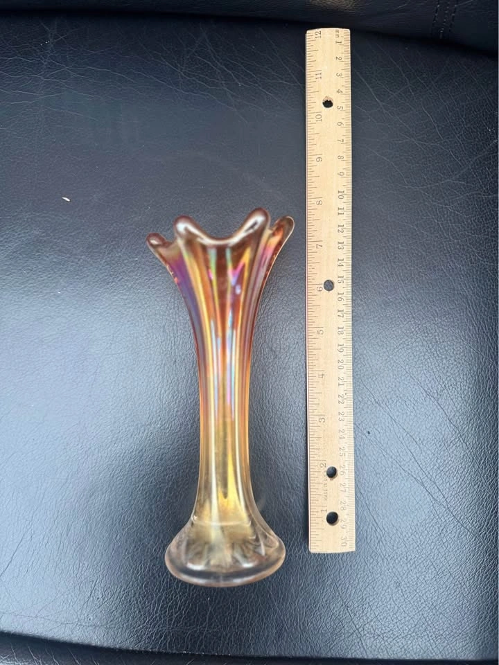 Vintage carnival glass bud vase approximately 6 3/4 inches tall. Gorgeous marigold colour picks up and reflects hues from nearby objects, increasing the appeal. Available for pick up in the Vermont Road in Kingston Road area. Cash only please.