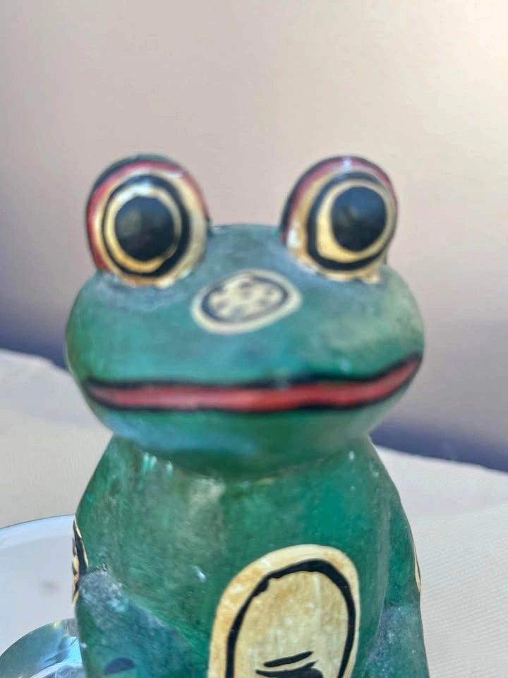 This vintage wooden frog shelf sitter figurine has personality galore. He was hand carved and hand painted in Indonesia in a folk art style. SFPF home. Birchmount between Kingston Road and Danforth.