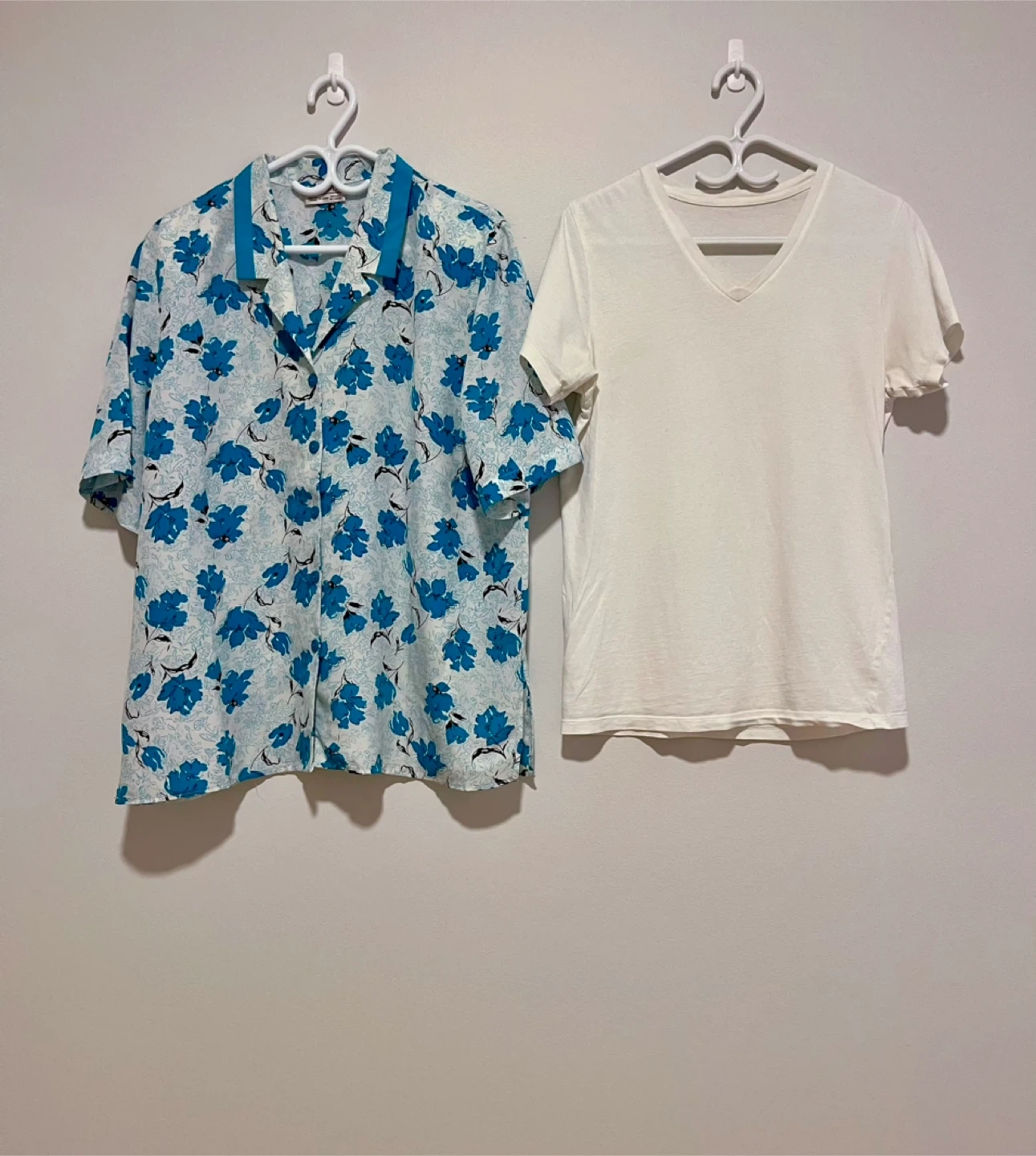 They’re in excellent condition -Dallaird's shirt with a floral patterns $10 -Calvin Klein $5 $12 for both Pick up in downtown The other is a simple white T-shirt. Both are in great shape and ready for a new home