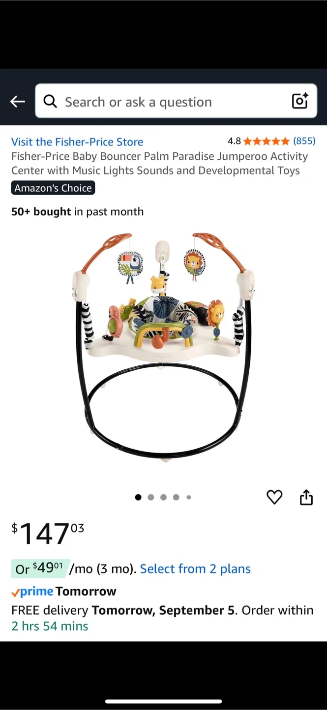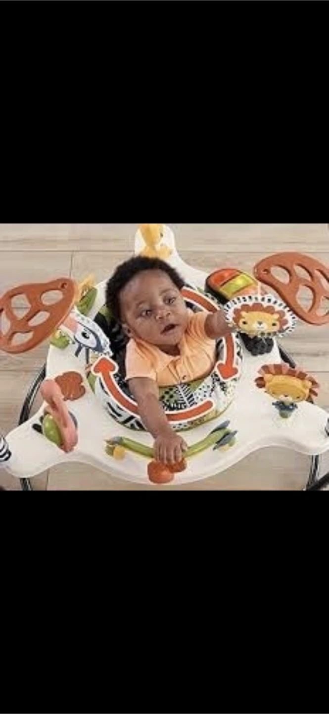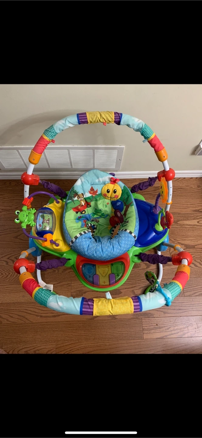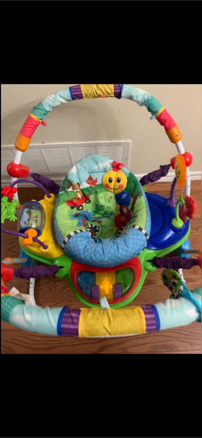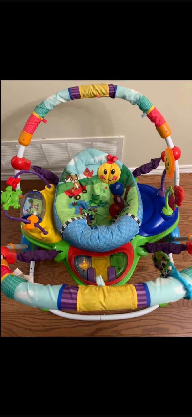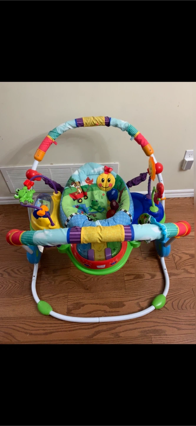 Play Bouncer with Toys, Lights, Sounds for Babies * Jungle-themed infant activity center that rewards your baby’s every jump with fun, toys have fun feel and sounds * Play with activities all around: bird-at leafs, sun spinner, frog roller ball, lion mirror, peek-a-boo dogs, bobble clouds * Plus a machine-washable seat pad for easy cleanup * Helps strengthen gross motor skills and engages developing senses of sight, hearing and touch Baby’s jump play centre is here to deliver the joy! Jump into cause & effect and role play fun with the Fun Activity Jumper. The 4 themed toy stations serve up endless entertainment for your little kid. Deliver with peek-a-boo play! Give the gift of pretend play all year long! Features a machine washable seat pad and wipeable toys for easy cleaning. Ages 6-12 months or up to 25 pounds Entertain and give your baby some fun! They will be quiet and have fun and be entertained while playing with toys and bouncing up and down in the bouncy play centre. Can be picked up or delivered Cheap - message me