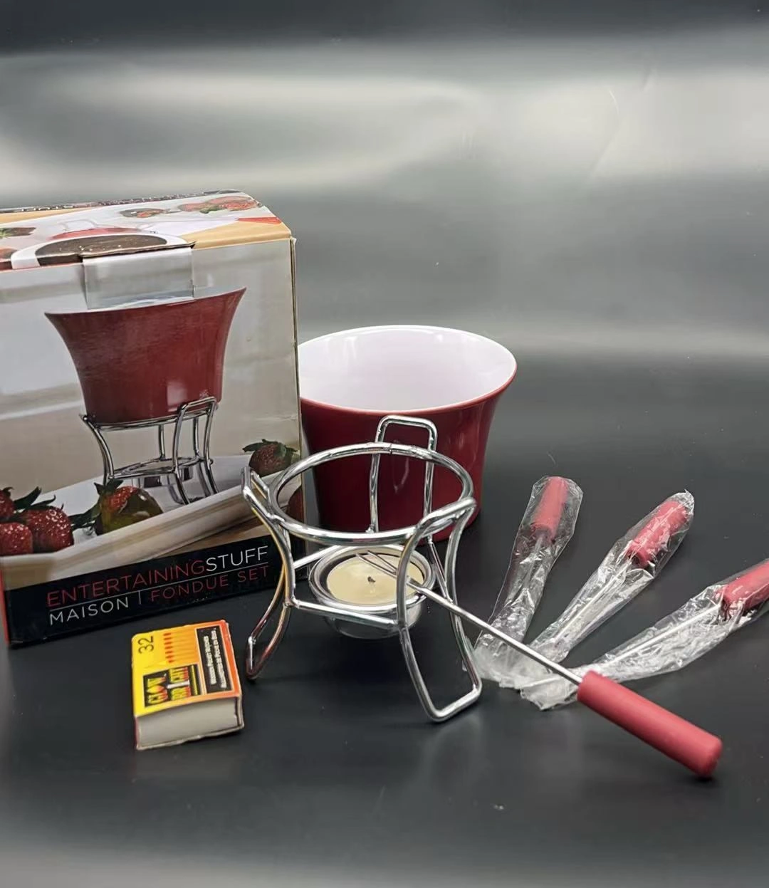Includes ceramic pot, metal stand, candle heater, and forks—perfect for enjoying melted cheese or chocolate fondue with friends.