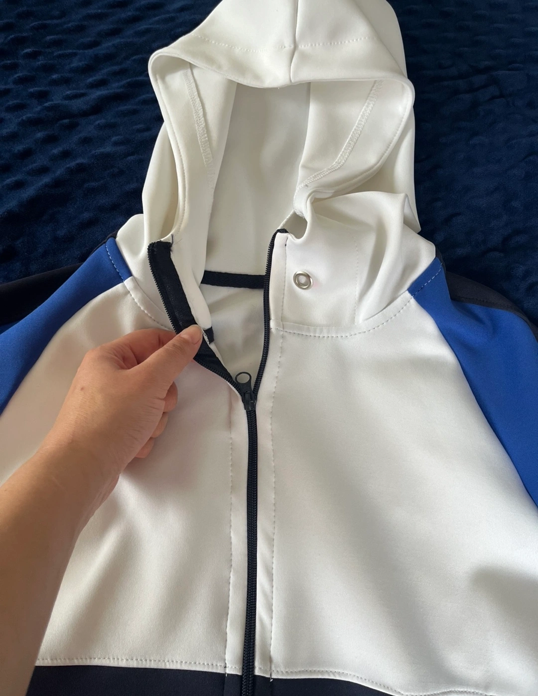 Selling a Nike full zip hoodie in a cool colour block design! It features blue, white, and black panels. Perfect for layering or wearing on its own. It's in great condition and ready for a new home!