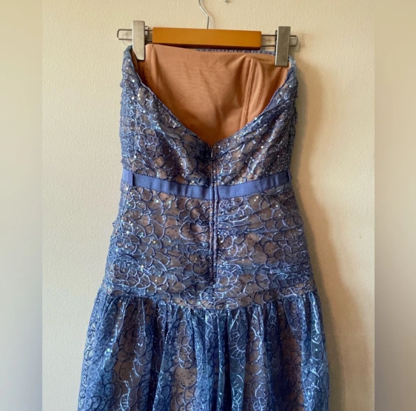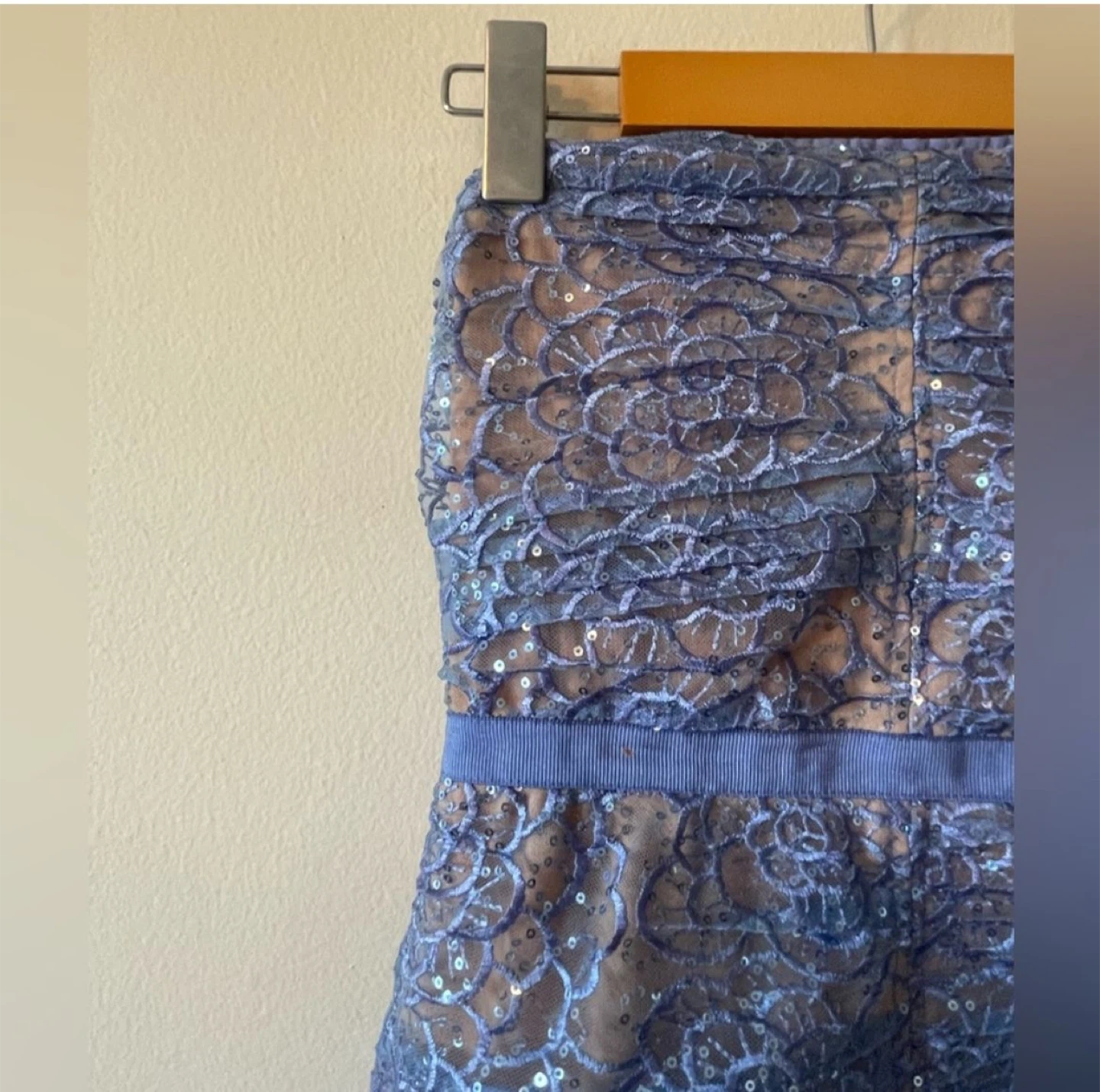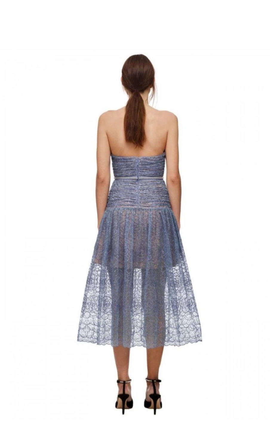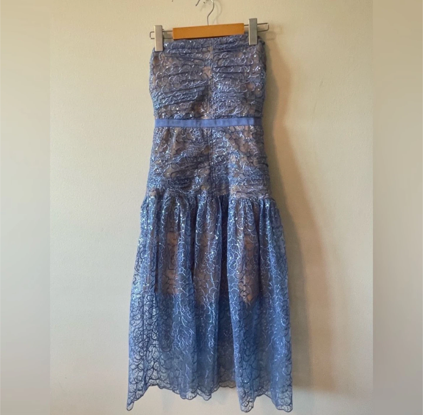 Beautiful blue lace strapless dress from Self Portrait. It features a flattering silhouette and delicate lace detailing. Perfect for a special occasion!