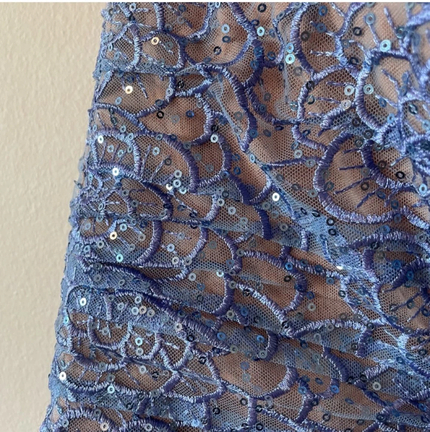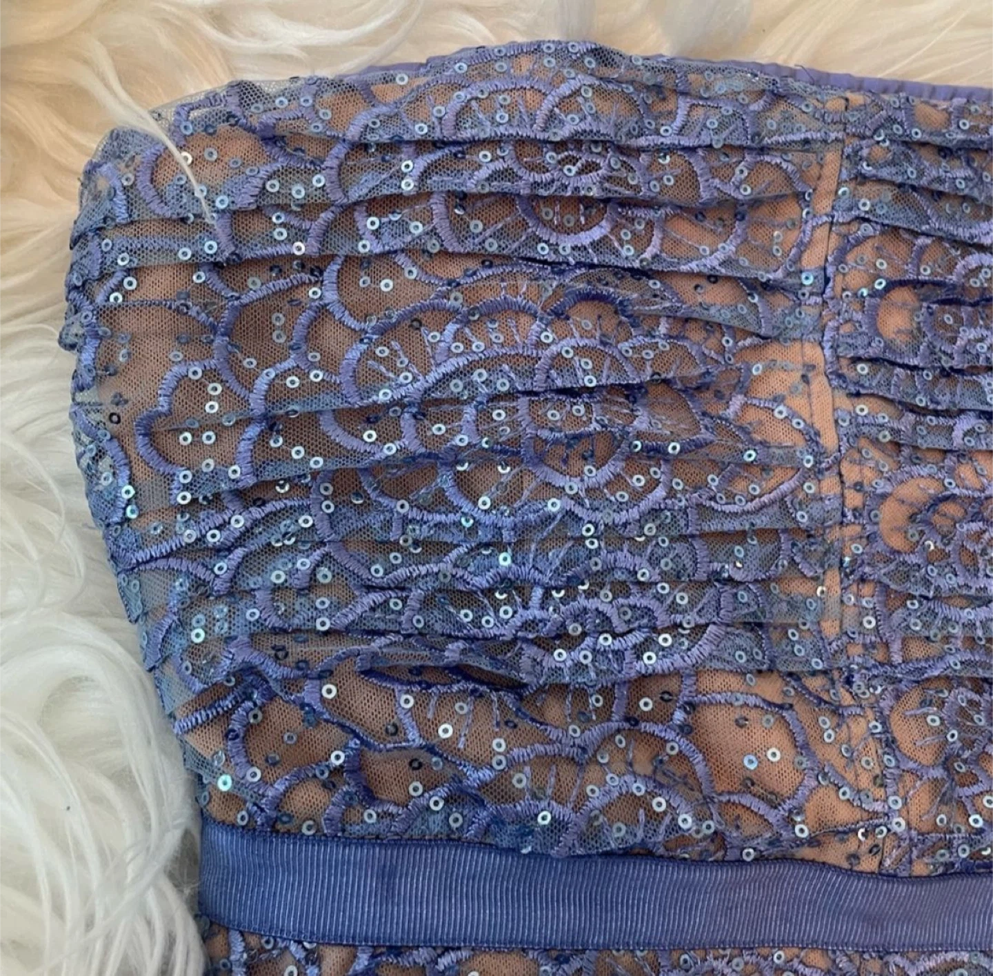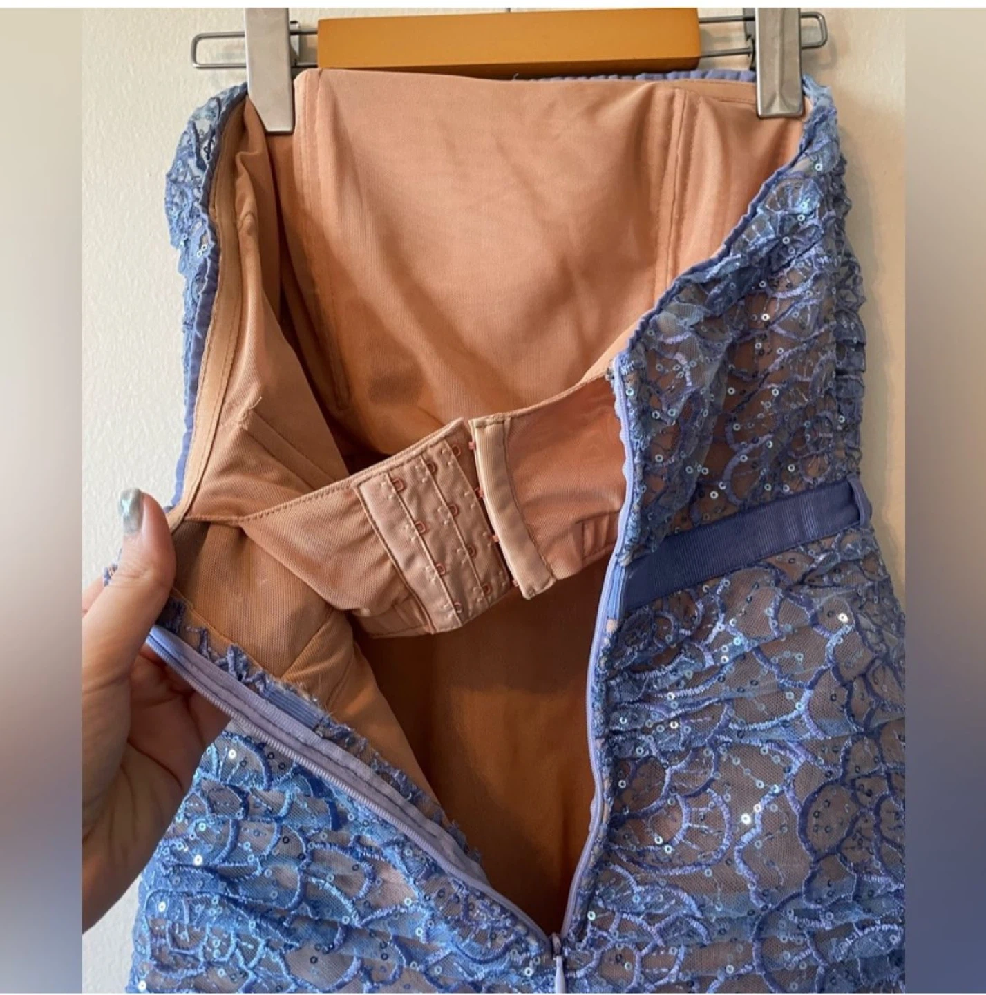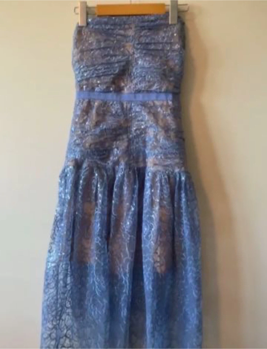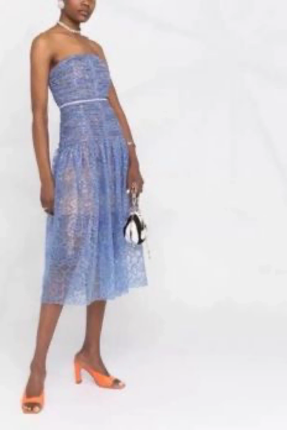 Beautiful blue lace strapless dress from Self Portrait. It features a flattering silhouette and delicate lace detailing. Perfect for a special occasion!