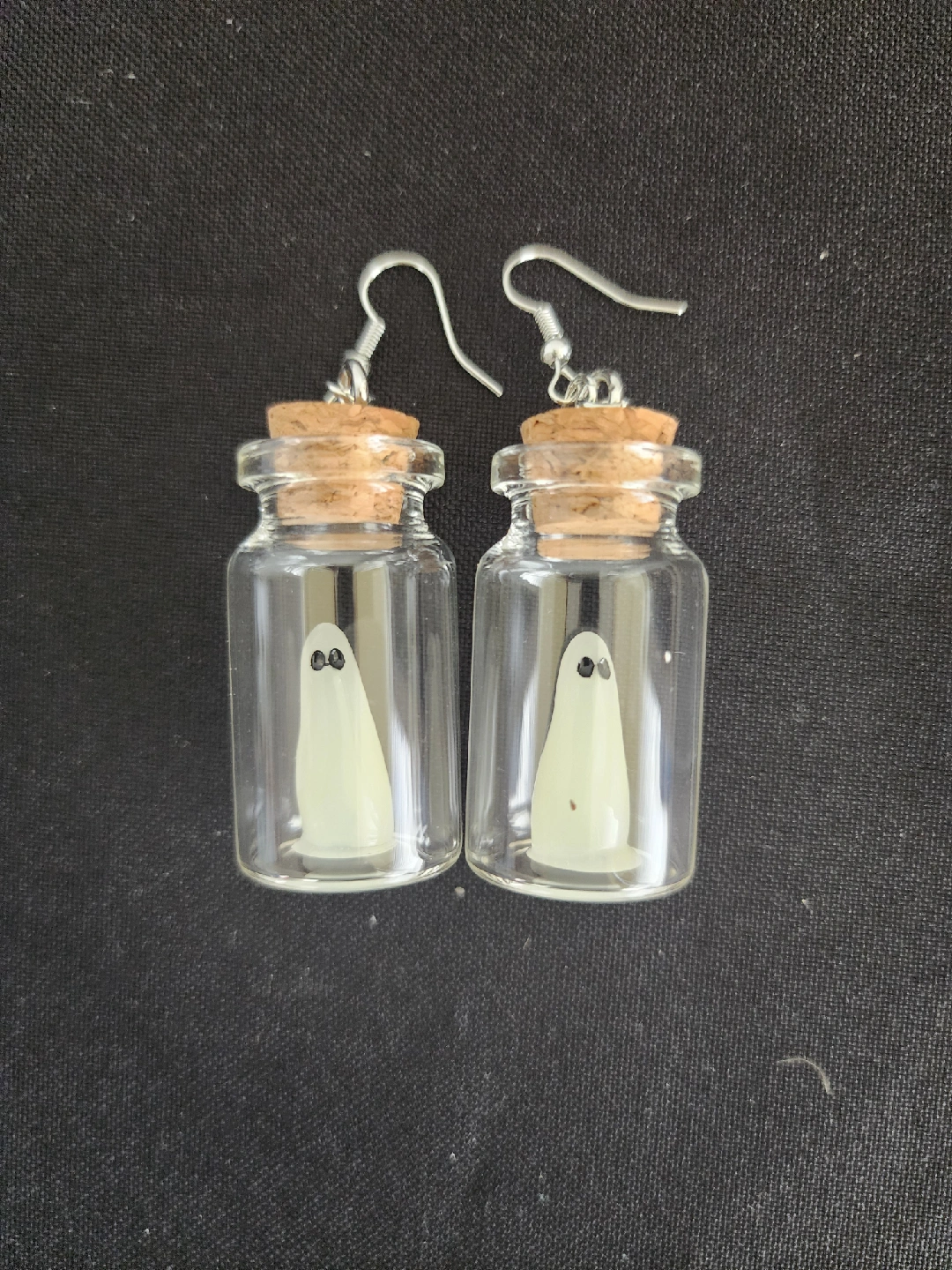 Ghost encased in glass bottles with cork stoppers earrings. Price firm.