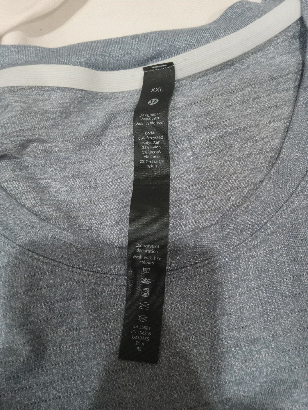 Selling a Lululemon T-shirt in size XXL. It's a nice grey colour and made of 65% recycled polyester, 33% rayon, 2% lycra elastane, and 2% nylon