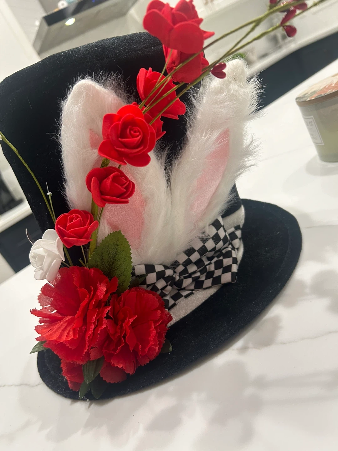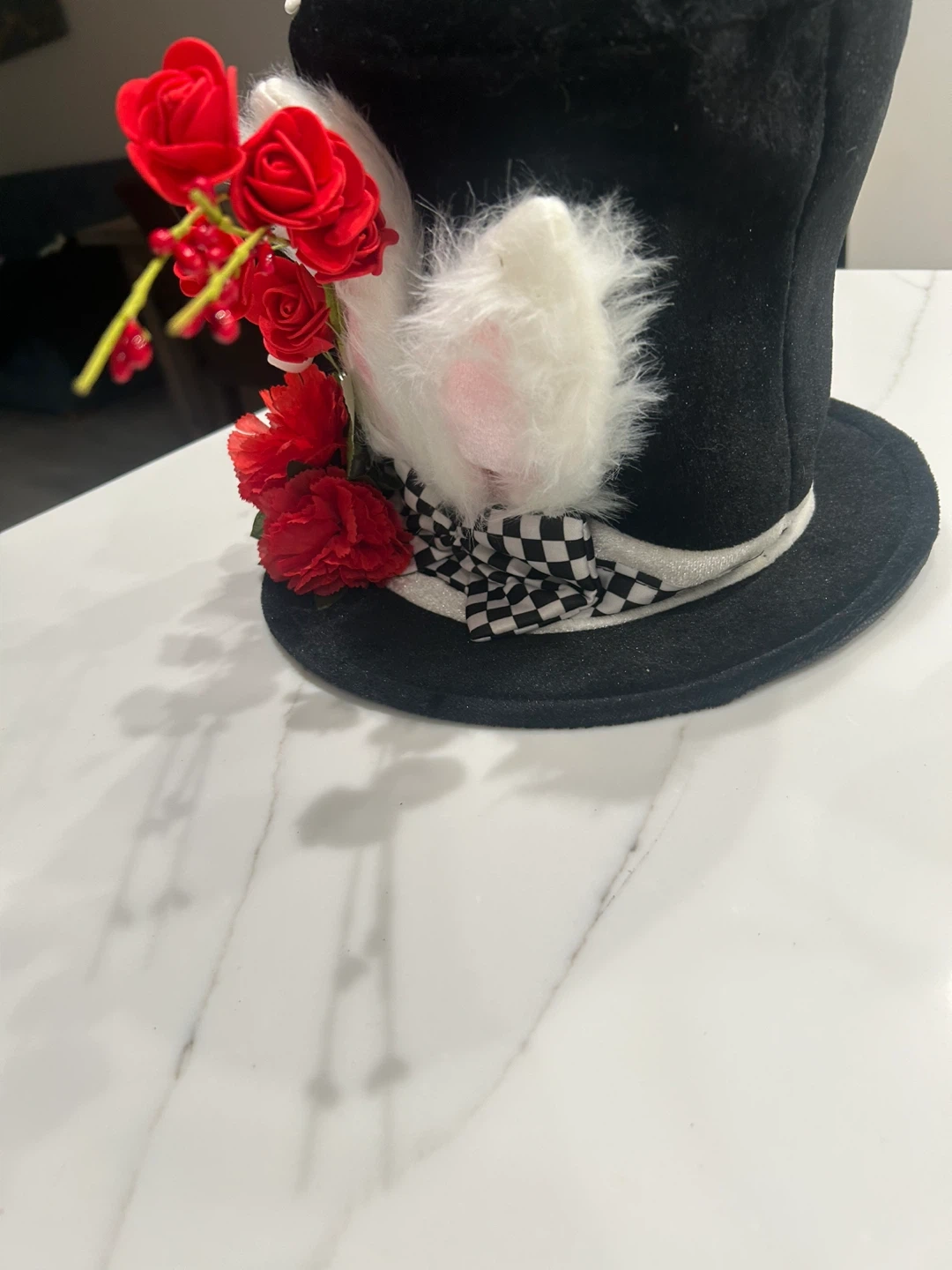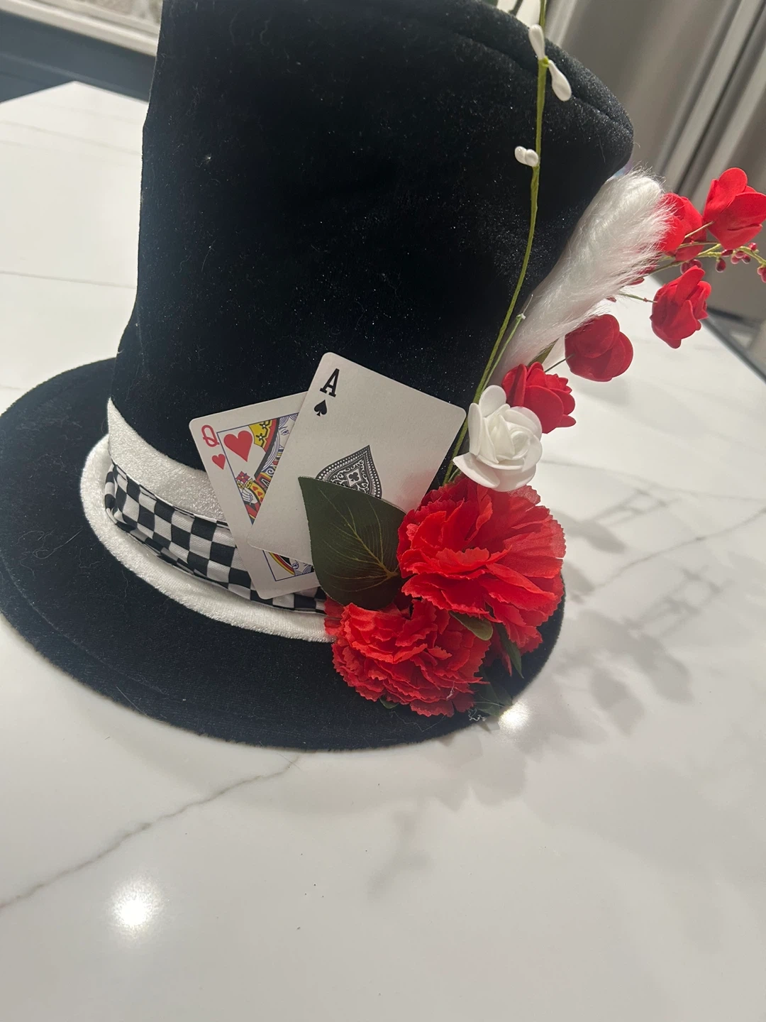 This Mad Hatter-style top hat is perfect for costumes or decoration for themed party.It features playing cards, flowers, and bunny ears for a whimsical touch .perfect for this Halloween or birthday themed ,Alice & wonderland 🎃also have clock and tea set and chair and several other items that go with it .will add in for free.