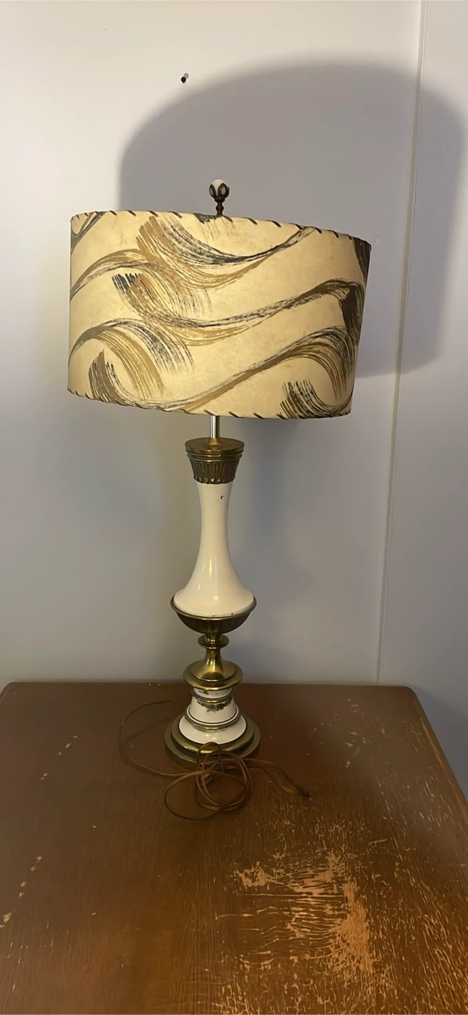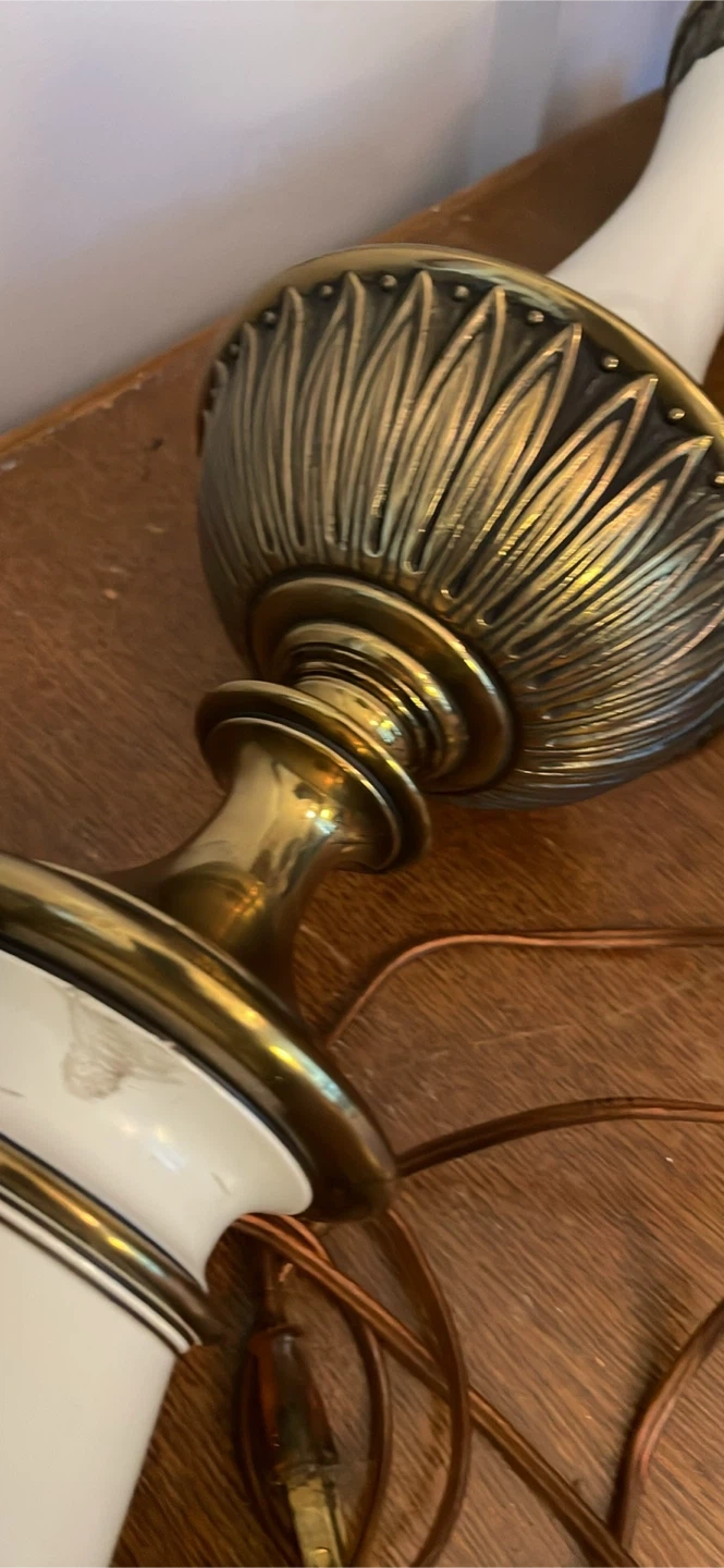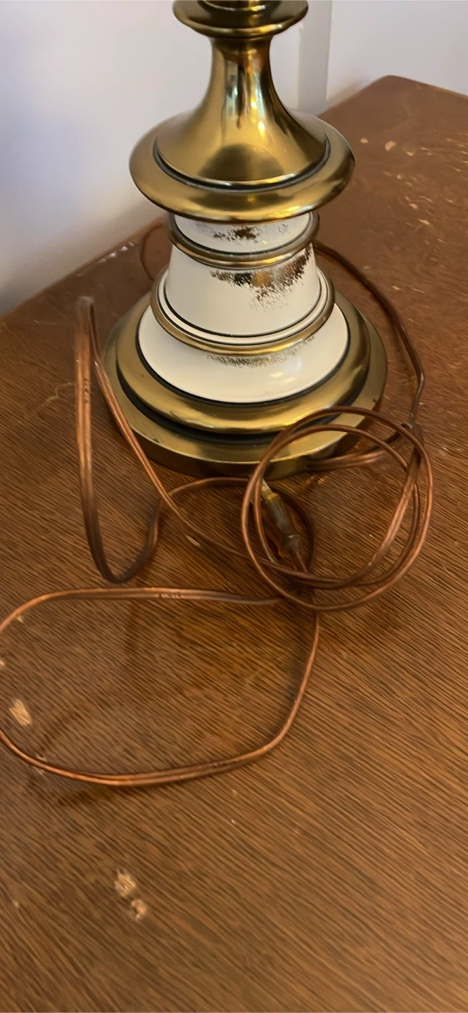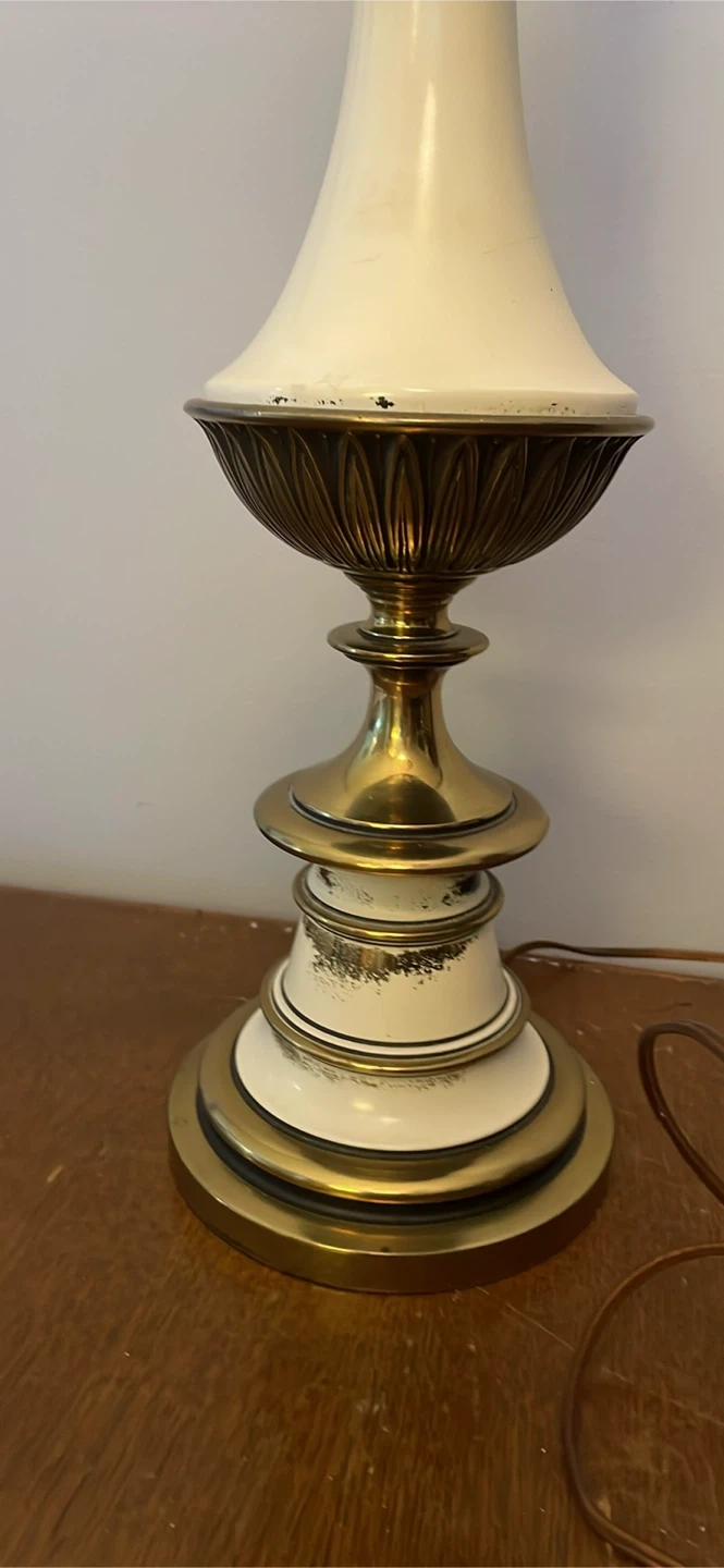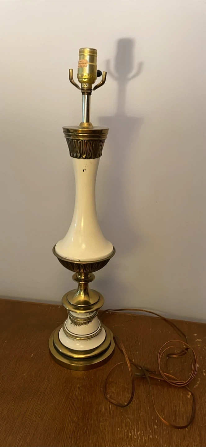 Selling a highly desirable 20th century vintage brass table lamp featuring a cream and gold colour scheme. It has a unique shabby chic design and could be a great addition to your home decor. Lamp shade and finial are NOT included. sold as is.