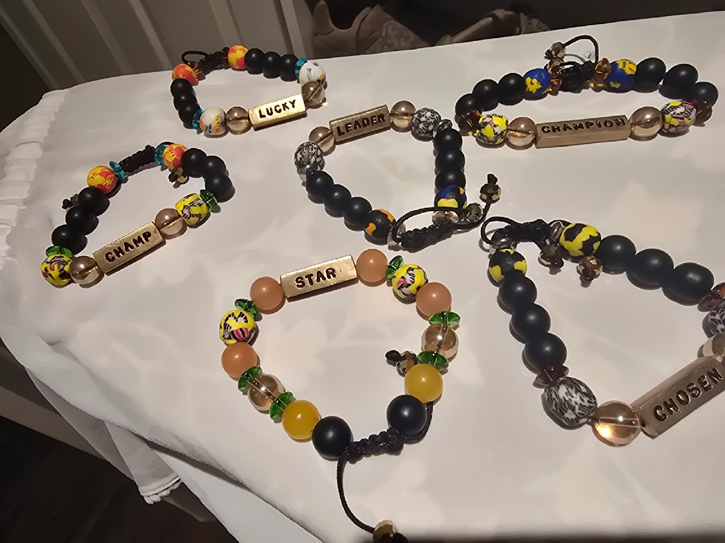 Check out these unique beaded bracelets! Each bracelet features different word charms: Lucky, Leader, Champion, Star, and Chosen. They're perfect for adding a personal touch to your style